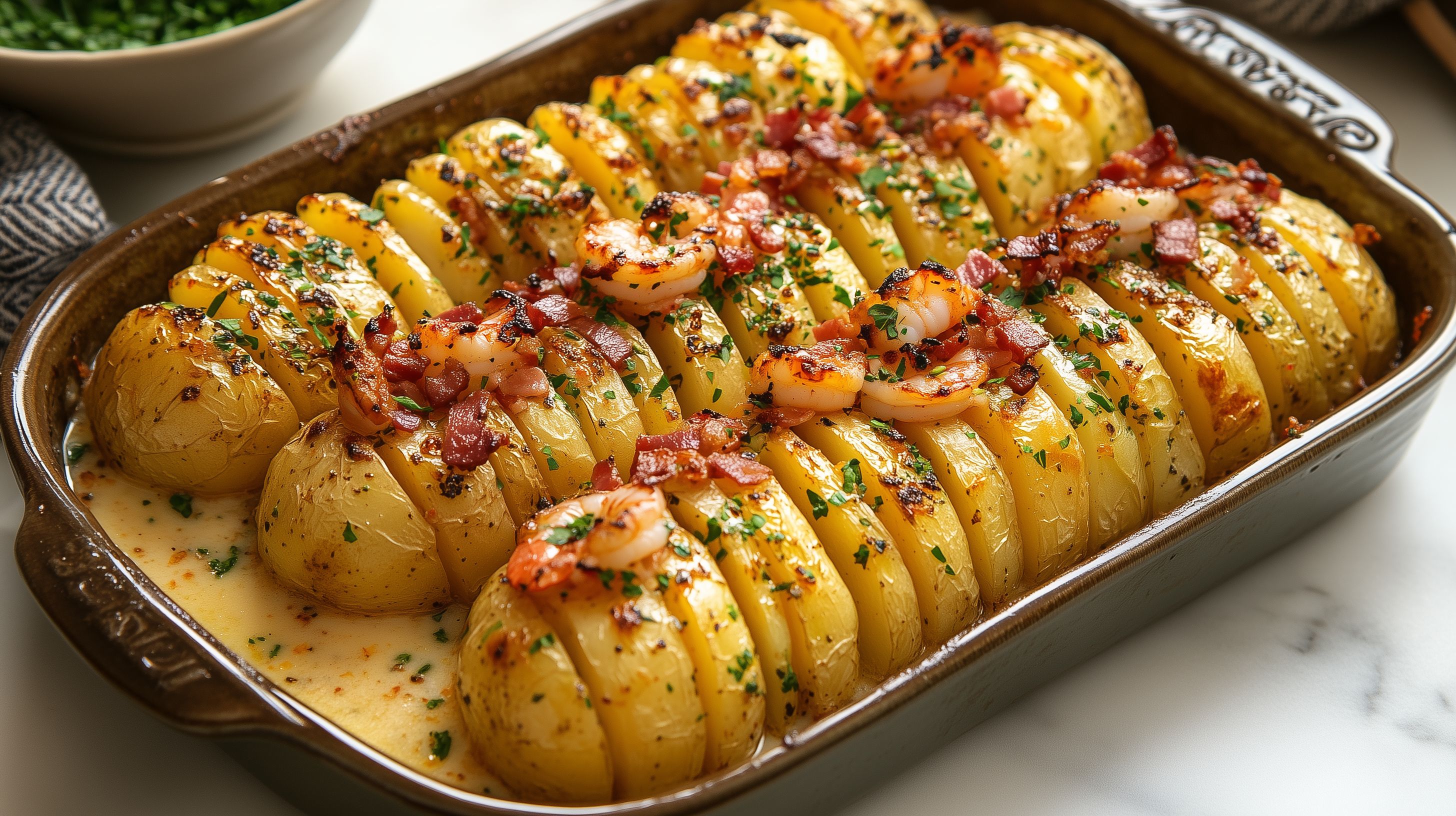 Das Bild zeigt einen appetitlichen Ofenauflauf mit Hasselback-Kartoffeln, würzigen Speckstücken und saftigen Garnelen. Die Kartoffeln sind fächerartig aufgeschnitten und mit einer Gewürzmischung aus Kräutern, Paprika und Salz bestreut, was ihnen eine knusprige Oberfläche verleiht. Der Speck und die Garnelen verleihen dem Gericht einen Hauch von Salzigkeit und Meeresfrische. Die Anordnung der Zutaten auf dem rustikalen Backblech ist sehr stimmungsvoll und lässt das Gericht äußerst appetitlich erscheinen. Dieses Bild eignet sich hervorragend als kostenloses Stockfoto für Rezeptblogger, Food-Magazine oder Werbekampagnen im Bereich Ernährung und Kulinarik. Die hochauflösende Datei steht unter einer Creative-Commons-Lizenz zur Verfügung.