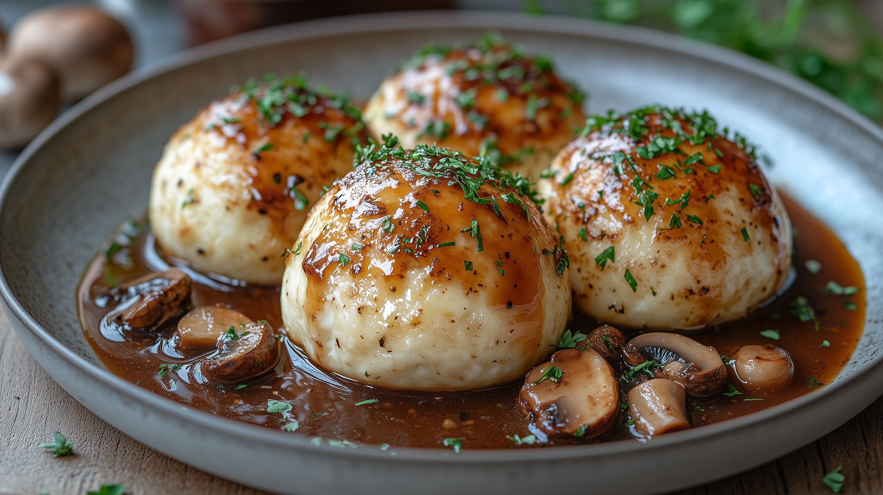 Dieses appetitliche Foto zeigt eine Platte mit frisch zubereiteten, knusprigen Semmelknödeln, die in einer cremigen Pilzsauce serviert werden. Die Knödel haben eine goldbraune Oberfläche und sind mit fein gehackter Petersilie bestreut, was dem Gericht eine natürliche Note verleiht. Die Pilzsauce umhüllt die Knödel und verleiht ihnen einen leckeren Geschmack. Das Arrangement auf dem rustikalen Holztisch ist stimmungsvoll und lädt zum genussvollen Verkosten ein. Dieses hochwertige Stockfoto eignet sich hervorragend für die Verwendung in Blogs, Newslettern, Social-Media-Beiträgen oder Werbematerialien rund um das Thema Kochen, Essen und Kulinarik. Es ist in hoher Auflösung verfügbar und unter einer Creative-Commons-Lizenz frei nutzbar.