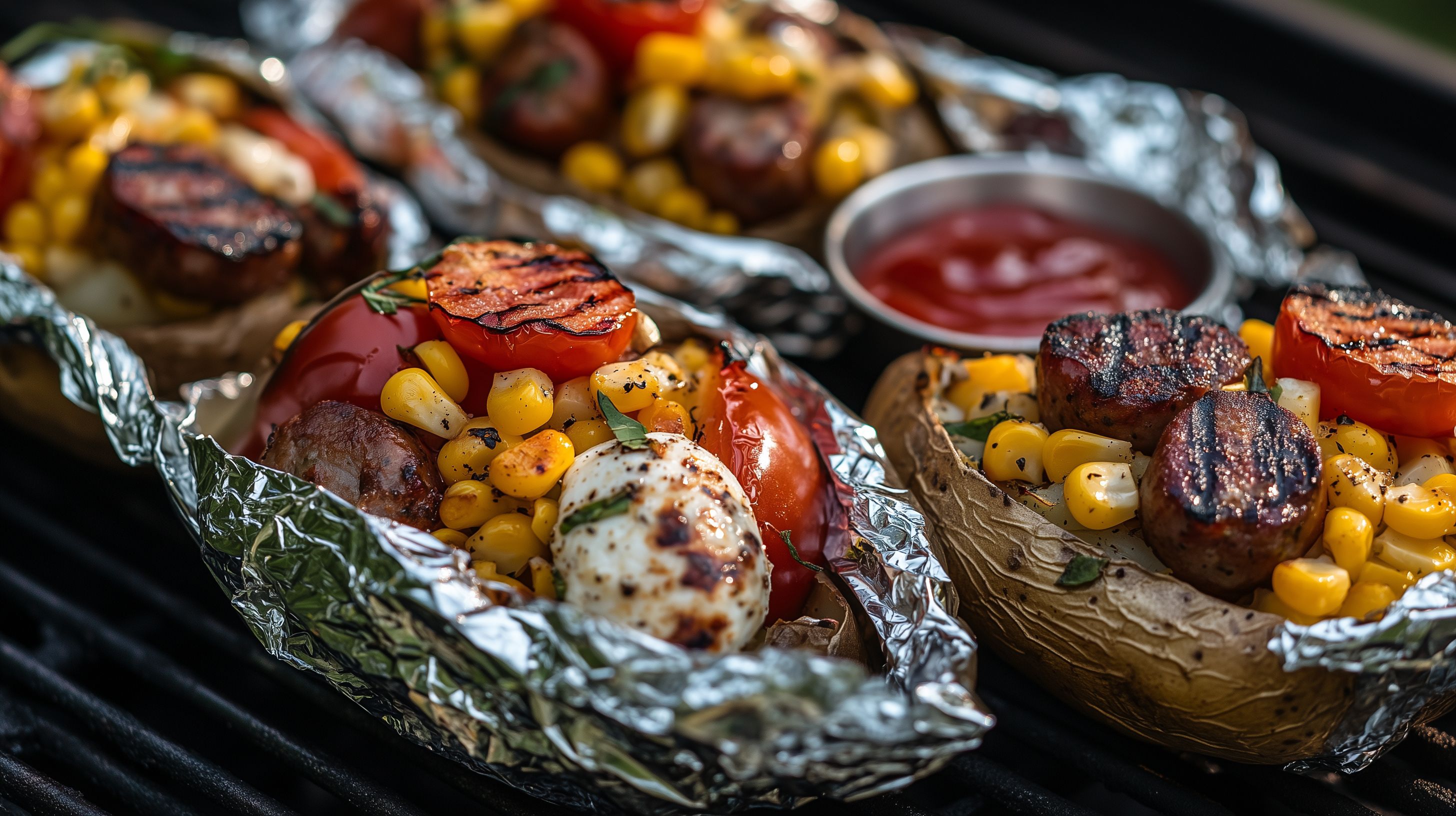 Dieses Foto zeigt ein leckeres, sommerliches Grillfleisch-Gericht mit gegrilltem Gemüse und Mais. In einer rustikalen Aluminiumfolie-Schüssel sind saftige Fleischstücke, bunte Paprikastücke, knackige Maiskörner und Tomaten angerichtet. Dazu wird eine leckere Barbecue-Soße serviert. Das Gericht strahlt eine appetitliche Optik aus und eignet sich hervorragend als Hauptspeise für ein Mittagessen oder Abendessen im Freien. Dieses hochwertige Stockfoto in hoher Auflösung kann beispielsweise für Werbekampagnen, Foodblogs oder Newsletter verwendet werden und steht unter einer kostenlosen Creative-Commons-Lizenz zur Verfügung.