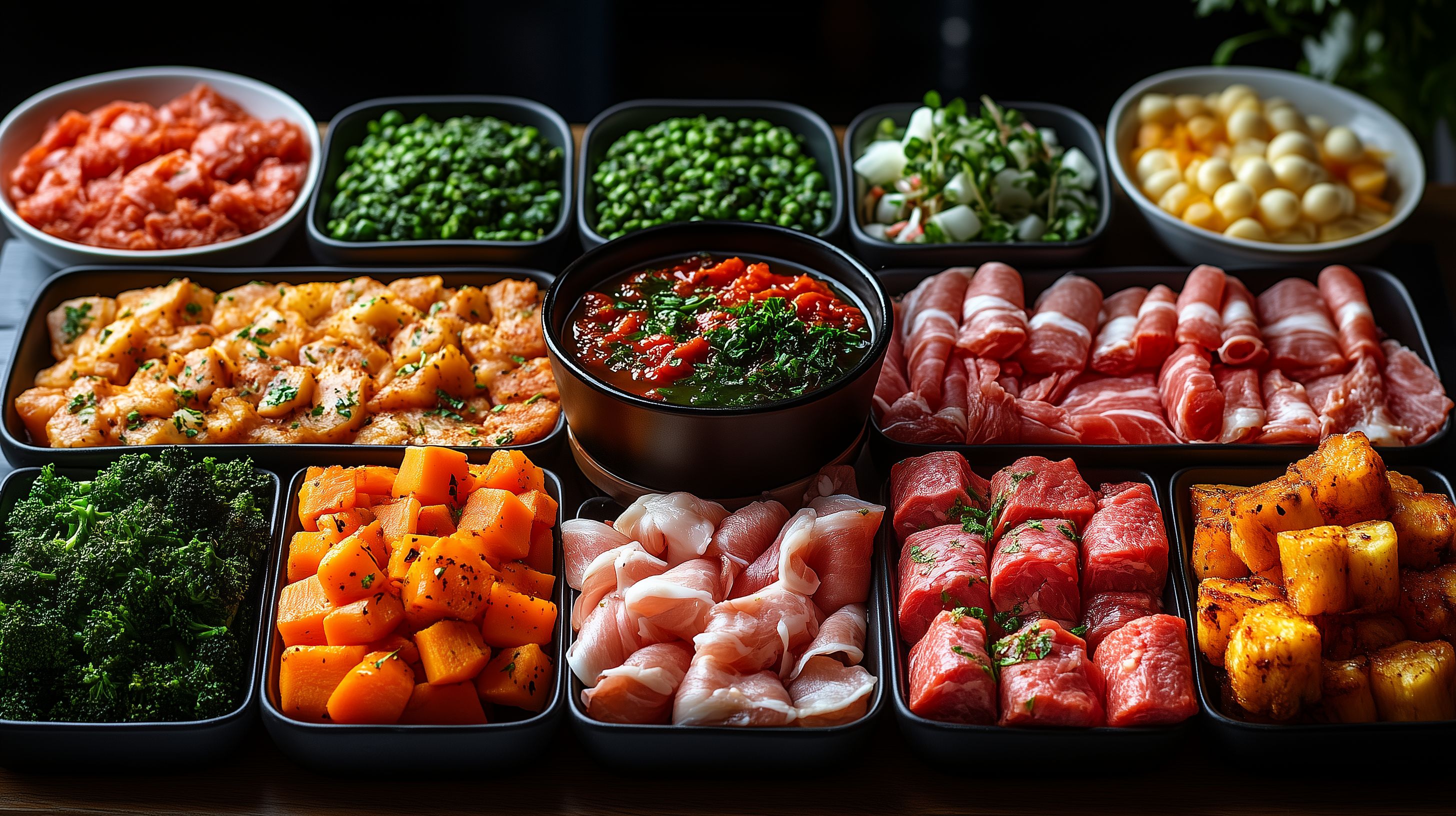 Dieses Foto zeigt eine Vielzahl an Zutaten, die für ein traditionelles Fleischfondue verwendet werden können. Auf einem Tablett sind verschiedene Fleischsorten, Gemüse, Saucen und weitere Komponenten ansprechend angeordnet. Die Vielfalt an Farben und Texturen lässt ein köstliches und abwechslungsreiches Fondue-Erlebnis erwarten. Das Bild eignet sich hervorragend als kostenloses Stockfoto für Websites, Blogs oder Social-Media-Beiträge rund um Kochen, Essen und Genuss. Die hochauflösende Datei steht unter einer Creative-Commons-Lizenz zur Verfügung.