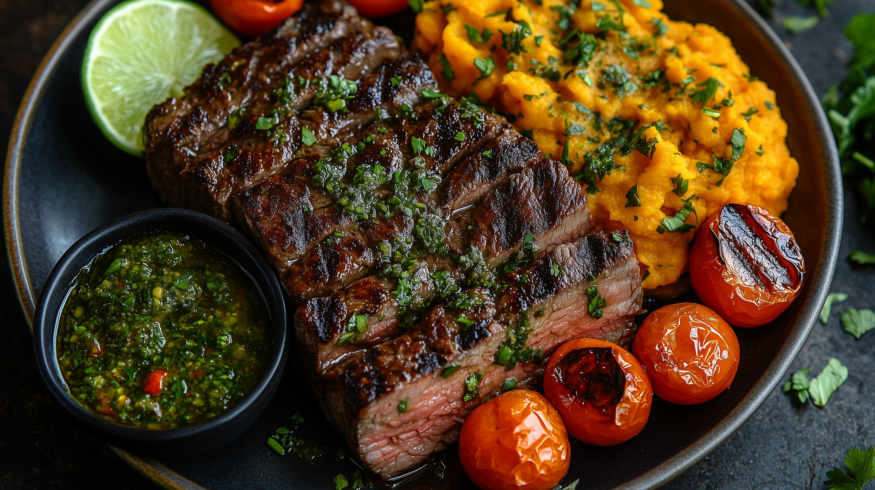 Das Foto zeigt ein leckeres Rindersteak, serviert mit Süßkartoffelpüree und einer würzigen Chimichurri-Sauce. Das Steak ist schön rosa gegart und mit einer köstlichen Kräutersoße beträufelt. Dazu gibt es gegrillte Tomaten, die dem Gericht einen frischen Akzent verleihen. Die kräftigen Farben und die rustikale Präsentation in einer dunklen Schale machen das Foto zu einem stimmungsvollen Eyecatcher für Rezeptseiten, Kochblogs oder Werbekampagnen rund um das Thema Grillgerichte und gehobene Küche. Dieses hochauflösende Foto kann als kostenloses Stockfoto unter der Creative-Commons-Lizenz genutzt werden.