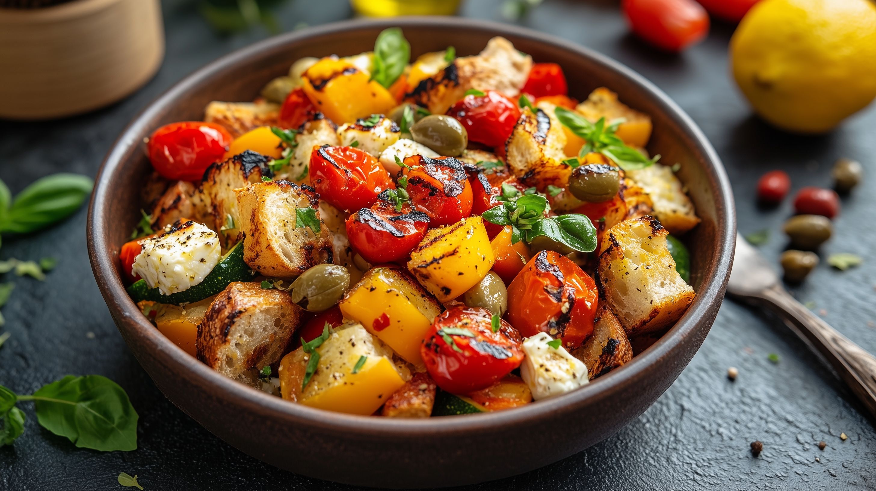 Dieses köstliche Foto zeigt einen rustikalen Tomatensalat mit grillmarinierten Gemüsewürfeln in einer schönen Tonschale. Die Tomaten, Paprika und Zucchini-Würfel sind mit einer Mischung aus Kräutern, Gewürzen und Olivenöl mariniert und dann gegrillt worden, was ihnen eine schöne Röstung und intensiven Geschmack verleiht. Dazu gesellen sich noch Oliven und frischer Basilikum, die dem Gericht eine mediterrane Note verleihen. Das Foto besticht durch seine lebendigen Farben, die rustikale Anmutung der Schüssel und die appetitliche Anordnung der Zutaten. Es eignet sich hervorragend als kostenloses Stockfoto für Rezepte, Kochbücher, Foodblogs, Werbung für gesunde Ernährung und vieles mehr. Das hochauflösende Bild steht unter einer Creative-Commons-Lizenz und kann frei verwendet werden.