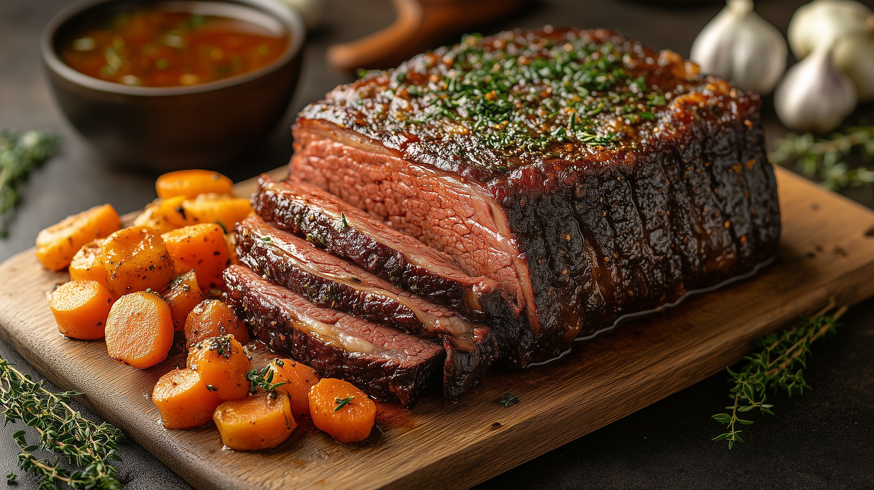 Dieses Foto zeigt ein appetitliches geschmortes Rinderbrisket, das auf einem rustikalen Holzbrett serviert wird. Das Fleisch ist saftig und mit einer knusprigen Kruste überzogen, die mit einer Gewürzmischung aus frischen Kräutern bestreut ist. Dazu werden gegrilltes Gemüse wie Möhren und andere Wurzelgemüse präsentiert, die dem Gericht eine farbenfrohe und gesunde Note verleihen. Die dunkle Holzoptik und die Anordnung der Zutaten schaffen eine stimmungsvolle, traditionelle Atmosphäre. Dieses Bild eignet sich hervorragend als kostenloses Stockfoto für Rezeptblogs, Kochbücher, Social-Media-Beiträge oder Lebensmittelwerbung in hoher Auflösung und unter Creative-Commons-Lizenz.