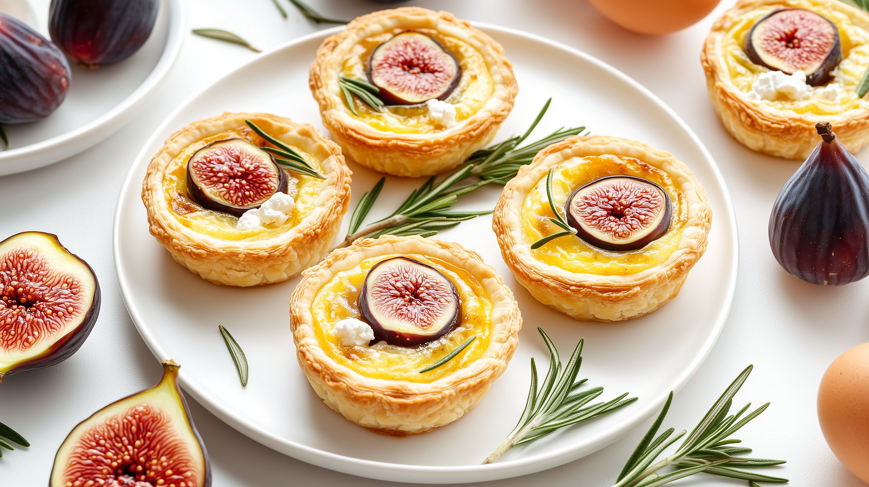 Dieses Foto zeigt eine Auswahl an leckeren Feigentörtchen, die auf einem weißen Teller angerichtet sind. Die Törtchen haben eine goldbraune, knusprige Kruste und sind mit halbierten Feigen und Ziegenkäse dekoriert. Umgeben sind sie von frischen Rosmarinzweigen, die dem Gericht einen rustikalen Touch verleihen. Die Komposition ist stilvoll und appetitlich, die Farbpalette aus Gelb, Rot und Grün wirkt natürlich und einladend. Dieses hochauflösende Stockfoto eignet sich ideal für die Verwendung in Blogbeiträgen, Newslettern, Social-Media-Posts oder Werbematerial rund um das Thema Kulinarik und Genuss. Es steht unter einer kostenlosen Creative-Commons-Lizenz zur Verfügung.