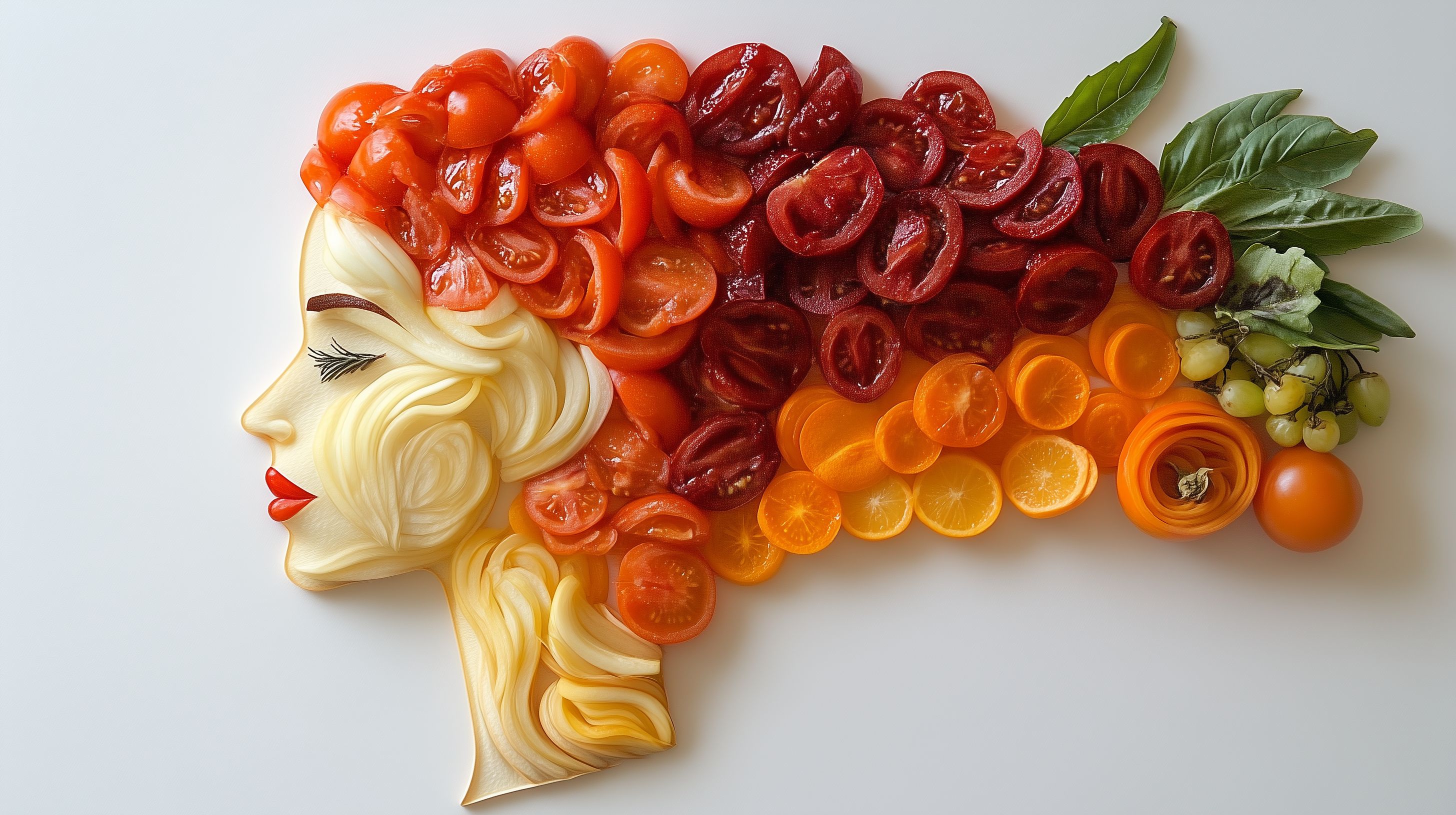 Dieses kreativ gestaltete Frauenportrait besteht aus verschiedensten Obst- und Gemüsesorten, die kunstvoll zu einem harmonischen Bild zusammengesetzt wurden. Die Gesichtszüge der Frau sind aus Zitrusfrüchten, Tomaten und Blattwerk geformt, während der Hintergrund weitere, farblich abgestimmte Elemente wie Weintrauben und Basilikum enthält. Das Bild strahlt Frische, Natürlichkeit und Gesundheit aus und eignet sich hervorragend für den Einsatz in Rezepten, Werbung für Lebensmittel oder Foodblogs. Als hochauflösendes, kostenloses Stockfoto unter Creative-Commons-Lizenz ist es vielseitig einsetzbar.