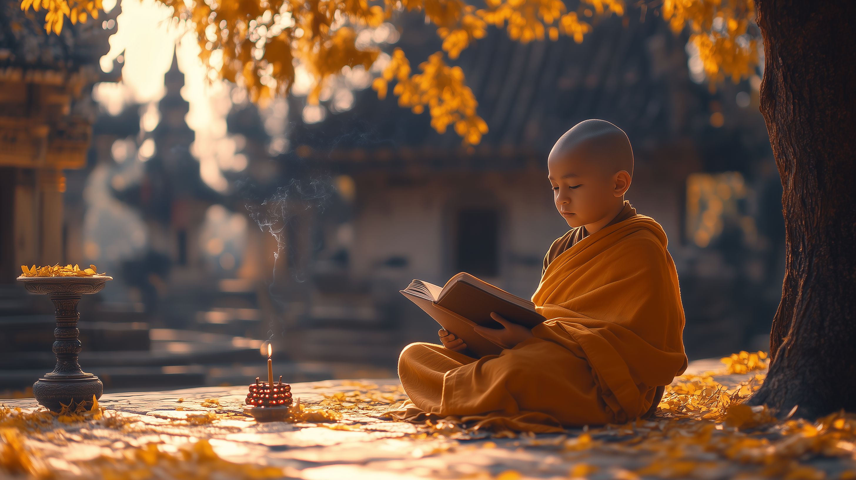 Das Bild zeigt einen jungen Mönch, der in einer friedlichen, herbstlichen Umgebung sitzt und konzentriert in einem Buch liest. Der Mönch ist in orange-gelbe Gewänder gekleidet und befindet sich umgeben von bunten Herbstblättern, einer Räucherschale und brennenden Kerzen. Die natürliche Szenerie strahlt eine meditative Atmosphäre aus und lädt den Betrachter ein, innezuhalten und zur Ruhe zu kommen. Dieses hochauflösende Stockfoto eignet sich hervorragend für den Einsatz in Blogbeiträgen, Newsletter, Social-Media-Posts oder Werbematerialien, die eine spirituelle, naturverbundene oder besinnliche Stimmung vermitteln möchten. Es steht unter einer Creative-Commons-Lizenz zur freien Nutzung bereit.