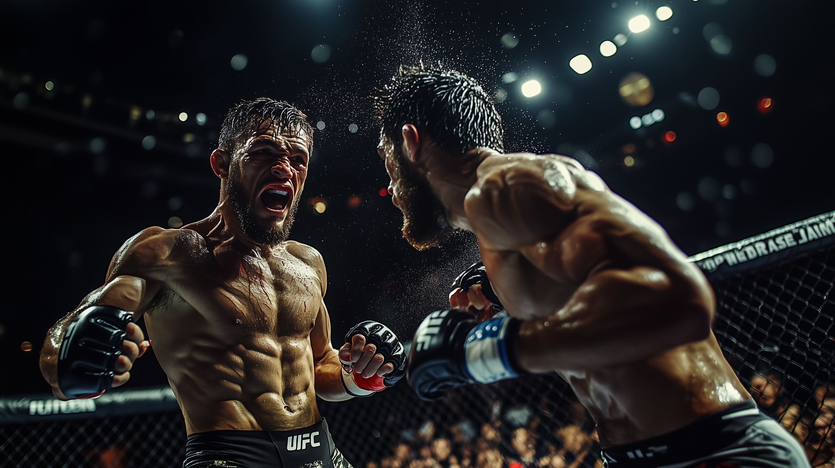 Das Bild zeigt zwei muskulöse UFC-Kämpfer mitten in einem erbitterten Kampf im Octagon. Die Athleten sind schweißüberströmt und geben alles, um den Sieg zu erringen. Die Szene ist dramatisch und voller Spannung, mit Bewegungsunschärfe, die die Dynamik des Geschehens unterstreicht. Dieses Foto eignet sich hervorragend für den Einsatz in Artikeln, Blogbeiträgen oder sozialen Medien rund um das Thema Kampfsport, Sport oder Action. Es steht unter einer kostenlosen Creative-Commons-Lizenz zur Verfügung und ist in hoher Auflösung erhältlich.