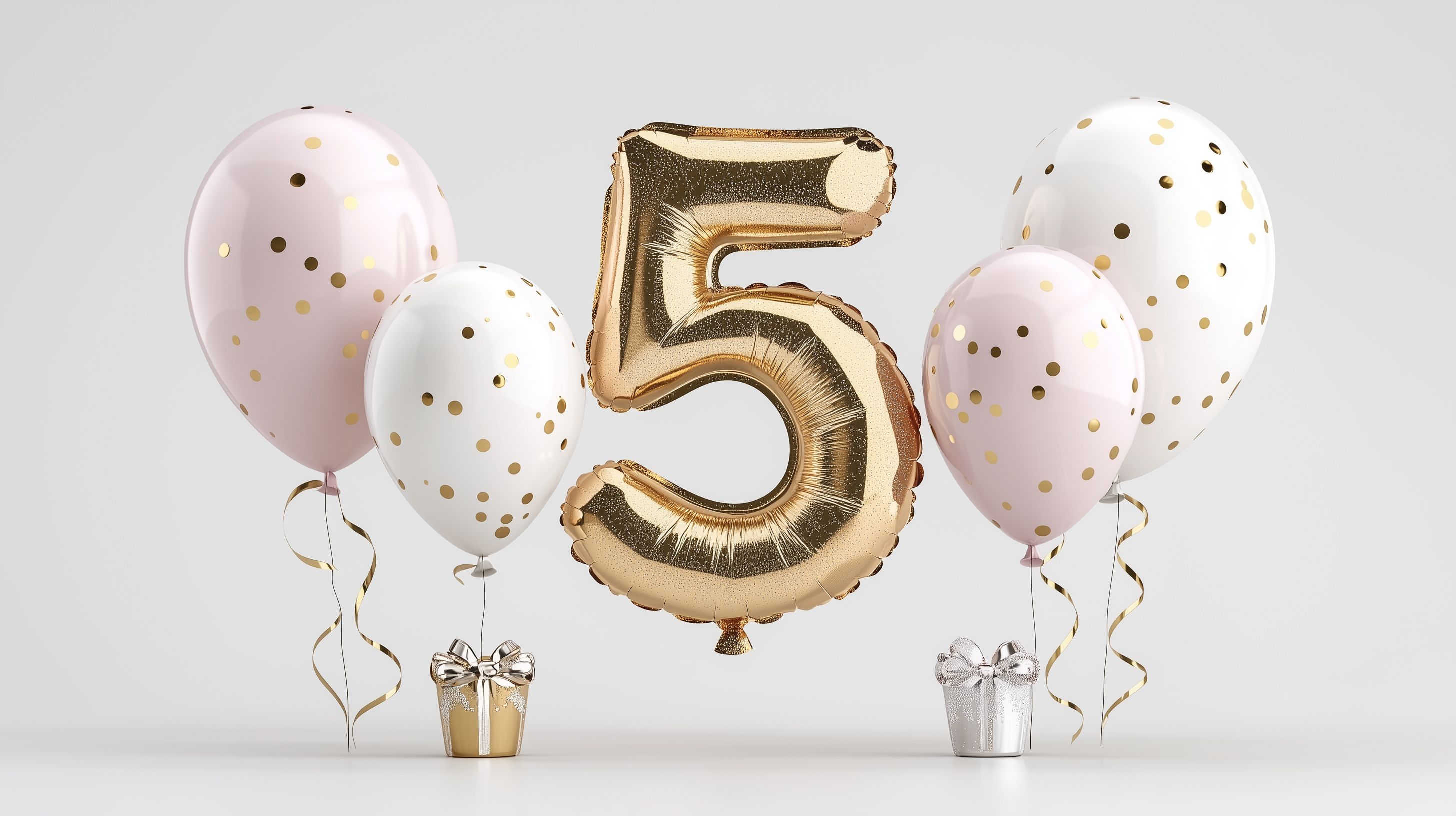 Dieses Bild zeigt eine festliche Geburtstags- oder Jubiläumsszene. Im Zentrum befindet sich eine große, goldfarbene Zahl '5', umgeben von rosa und weiß gemusterten Luftballons sowie zwei kleinen Geschenkboxen. Die Komposition ist sorgfältig arrangiert und verleiht dem Motiv einen hochwertigen, exklusiven Look. Das Foto eignet sich hervorragend für Geburtstagskarten, Einladungen, Werbemittel und andere Anwendungen, bei denen eine festliche Stimmung erzeugt werden soll. Das hochwertige Stockfoto ist in hoher Auflösung und unter einer Creative-Commons-Lizenz frei verwendbar.