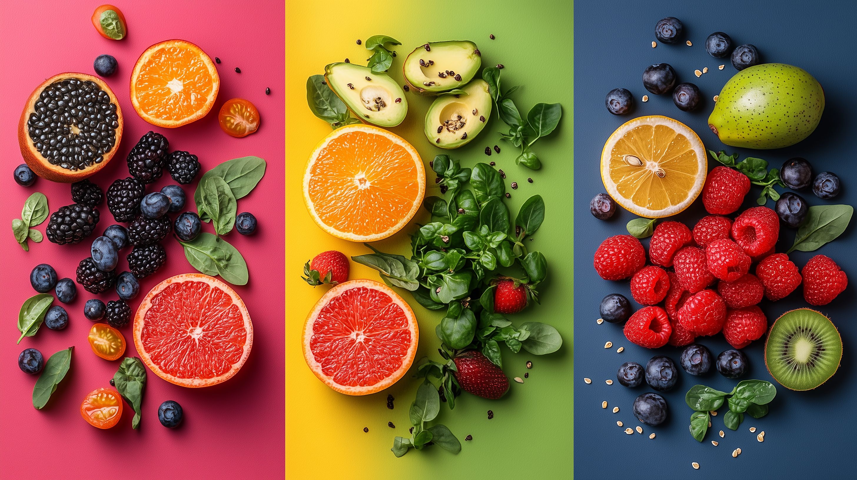 Diese vibrante und lebendige Collage aus frischen Früchten und Gemüsesorten bietet ein einzigartiges Stillleben voller Farbe und Kontraste. Die sorgfältig arrangierten Elemente, vom leuchtenden Orange der Orangen über das Saftige Grün der Avocados bis hin zu den dunkelroten Heidelbeeren, schaffen eine visuelle Harmonie, die den Betrachter in eine gesunde und natürliche Welt entführt. Dieses kostenlose Stockfoto in hoher Auflösung eignet sich perfekt für den Einsatz in Blogbeiträgen, Newslettern, Social-Media-Kampagnen oder Werbematerialien, die ein frisches, modernes und einladendes Ambiente vermitteln möchten. Unter der Creative-Commons-Lizenz kann es frei verwendet werden.