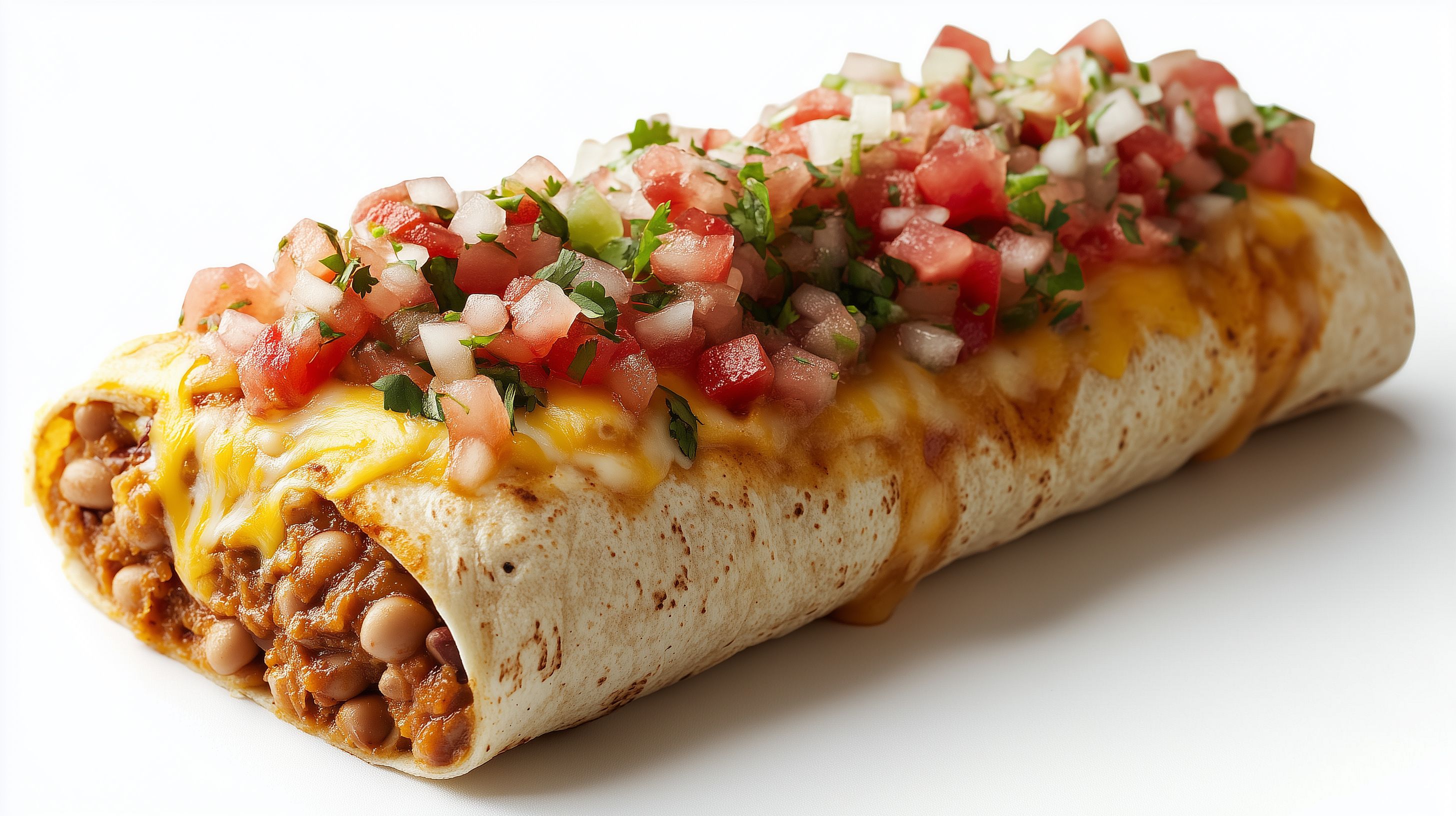 Das Bild zeigt einen appetitlichen mexikanischen Mollete, eine Art Burrito mit einer Füllung aus Bohnen, geschmolzenem Käse und frischer Tomatensalsa. Der lange, rechteckige Teigwrapper ist in einem rustikalen, natürlichen Stil fotografiert und vor einem weißen Hintergrund platziert. Die Salsa auf der Oberseite sorgt für einen farbenfrohen Kontrast und verleiht dem Gericht eine authentische mexikanische Note. Dieses hochauflösende Stockfoto eignet sich hervorragend für Verwendung in Rezeptbüchern, Foodblogs, Gastronomiewerbung oder anderen Kontexten, in denen authentische und appetitliche mexikanische Speisen präsentiert werden sollen. Es steht unter einer kostenlosen Creative-Commons-Lizenz zur Verfügung.