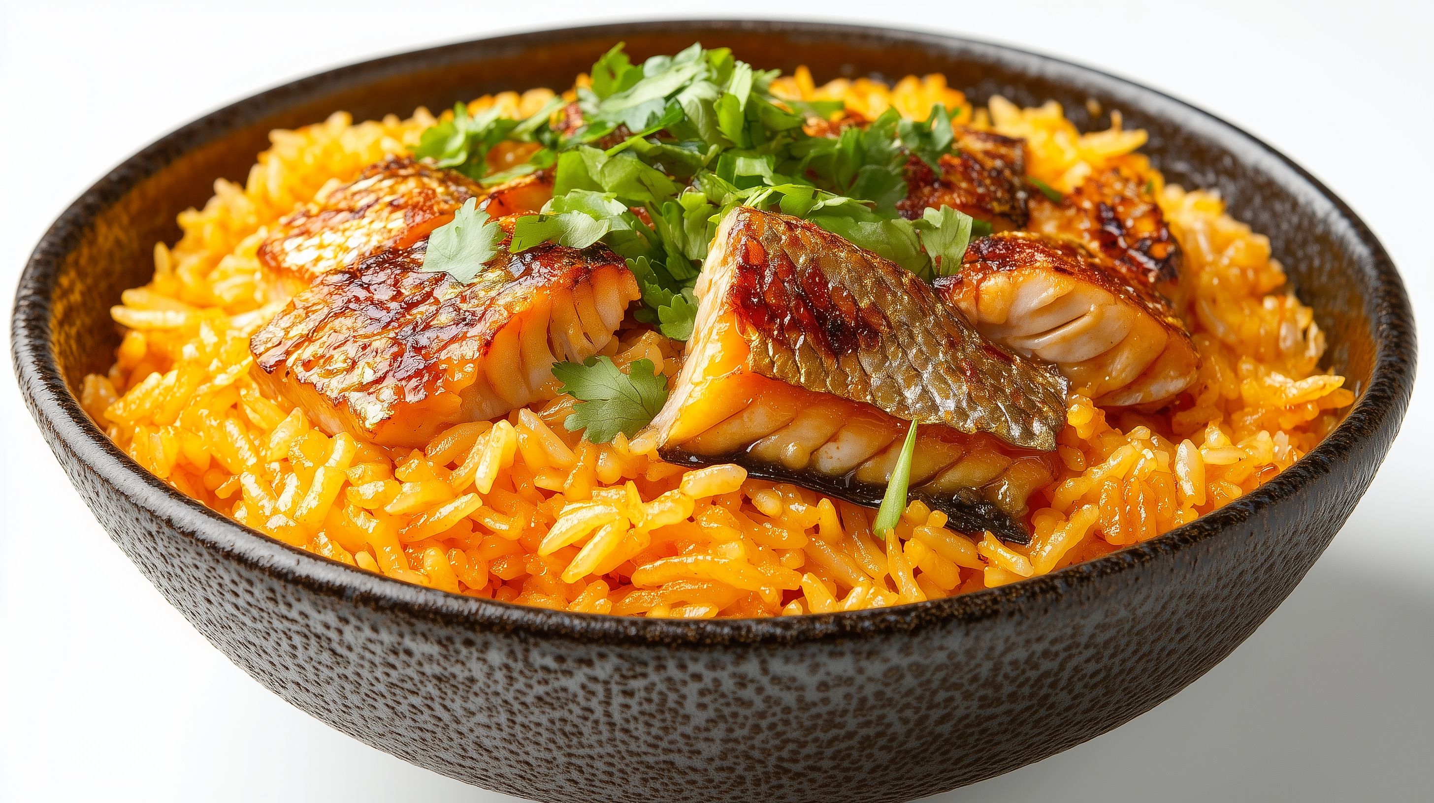 Das Bild zeigt ein leckeres orientalisches Reisgerich mit Grillfilet. Der Reis ist in einer rustikalen Holzschale angerichtet und mit verschiedenen Gewürzen und frischen Kräutern garniert. Der Fisch hat eine schöne karamellbraune Kruste und liegt fächerartig auf dem Reis. Das Gericht strahlt eine warme, authentische Atmosphäre aus. Dieses hochauflösende Stockfoto eignet sich perfekt für Rezeptblog-Beiträge, Social-Media-Posts zum Thema Kulinarik oder als Eyecatcher in Werbekampagnen für exotische Speisen. Das Foto ist unter einer Creative-Commons-Lizenz frei verwendbar.