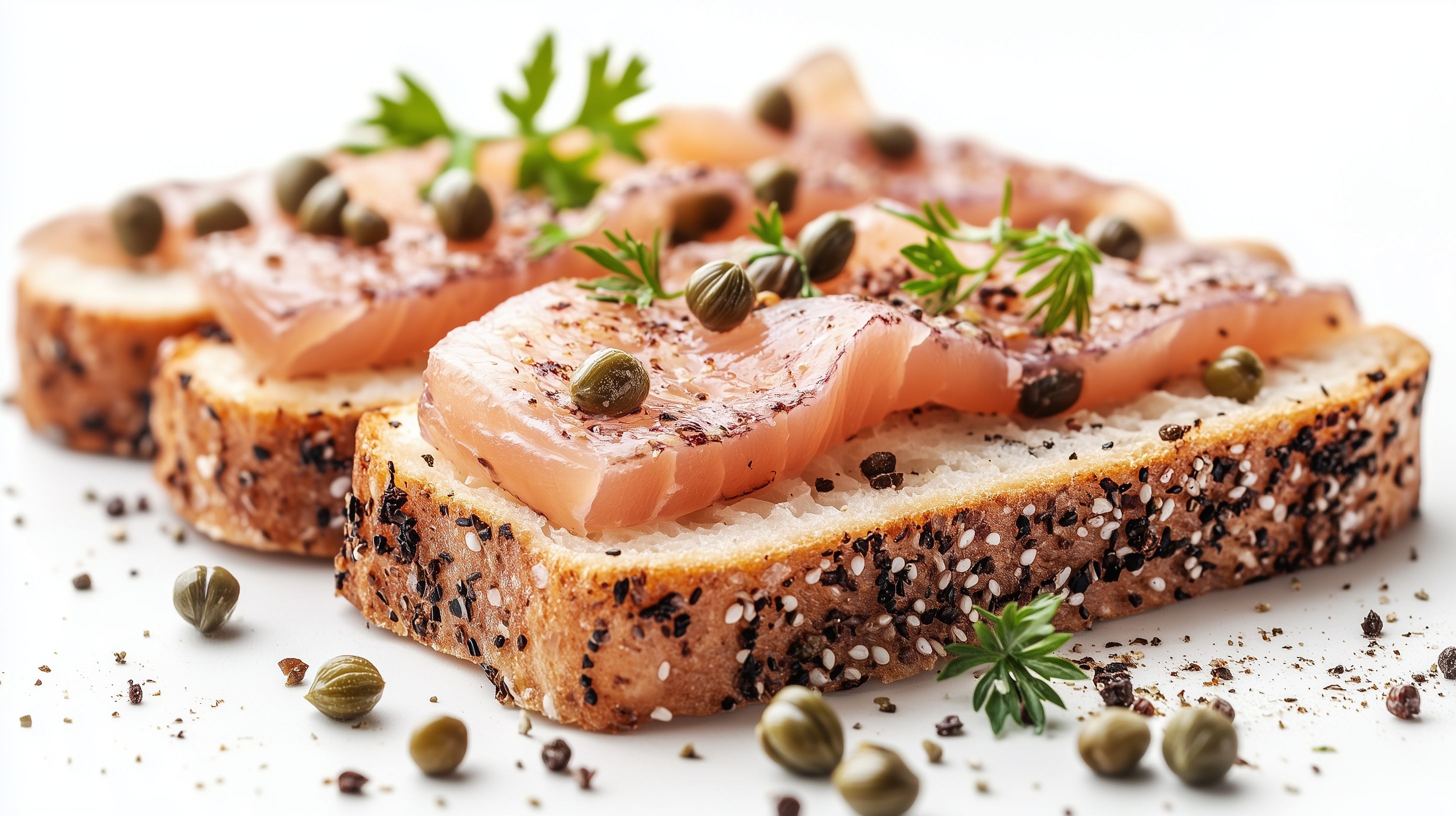 Dieses appetitliche Foto zeigt geröstetes Brot mit Lachs, Kapern und Petersilie. Die rustikale, nahsichtige Aufnahme präsentiert das Gericht in einer stilvollen, detailreichen Darstellung. Diese dekorative Speise eignet sich ideal für Foodblogs, Kochrezepte oder Werbematerial rund um das Thema Dänische Küche und leckere Snacks. Als hochwertiges Stockfoto in kostenloser, lizenzfreier Verwendung können Sie dieses Bild für Ihre digitalen Projekte nutzen.