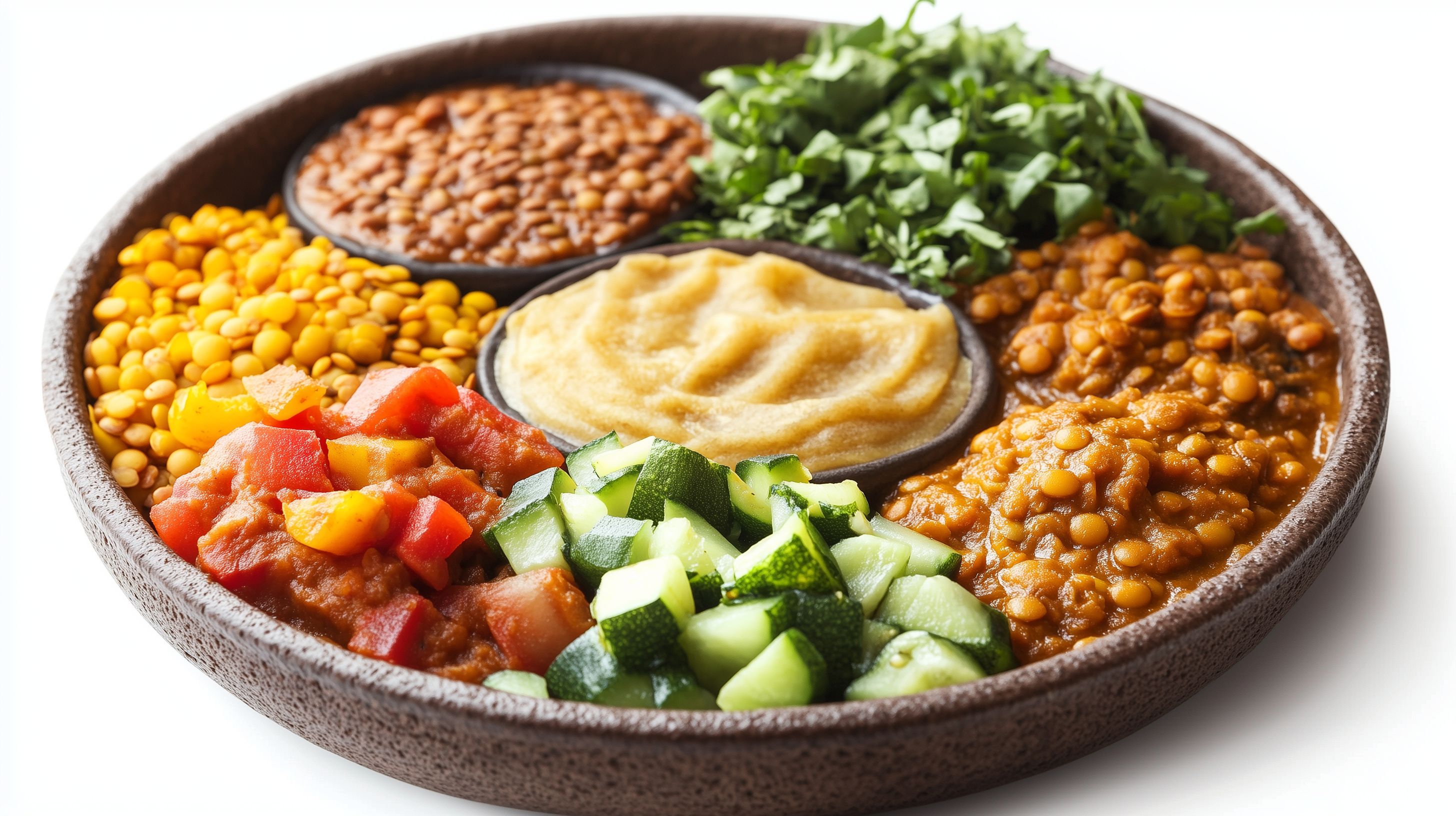 Dieses Foto zeigt eine Schüssel voller bunter, traditioneller äthiopischer Linsengerichte und Gemüsezutaten. Im Zentrum befindet sich eine Portion eines cremigen Gerichts, umgeben von Häufchen mit verschiedenen Linsen, Mais, Tomatenwürfeln und Gurkenscheiben. Die Anordnung der Zutaten in der rustikalen Schüssel ist äußerst appetitlich und lädt zum Probieren ein. Dieses kostenlose Stockfoto in hoher Auflösung unter Creative-Commons-Lizenz eignet sich hervorragend für Rezeptbücher, Food-Blogs, Ernährungsratgeber oder Werbematerialien rund um gesunde, vegetarische Essenskreationen.