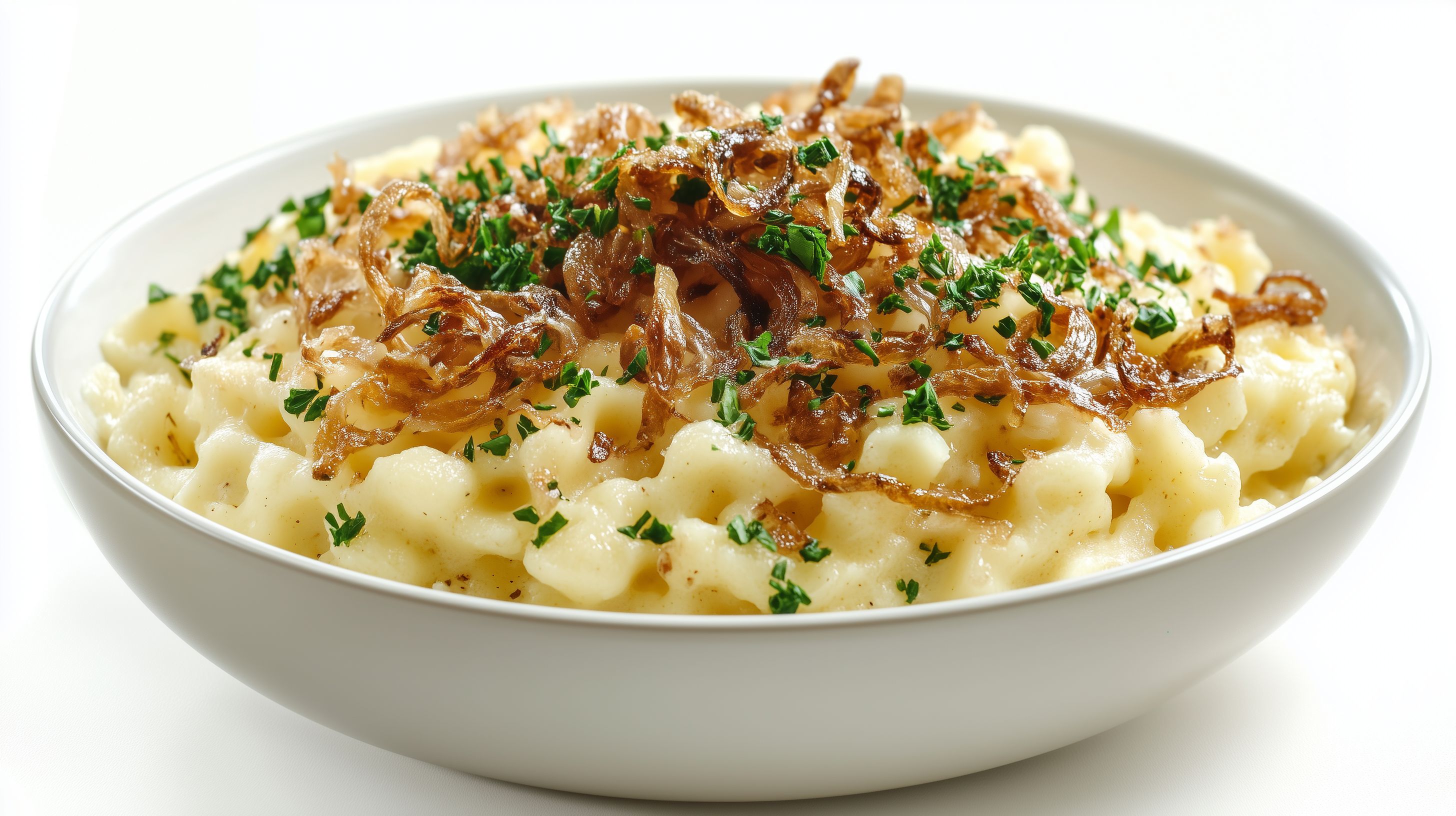 Dieses appetitliche Foto zeigt eine Schüssel voller deftiger, deutscher Käsespätzle, überkrönt von karamellisierten Zwiebeln. Die Nudeln sind cremig und saftig, während die goldbraunen, süß-herben Zwiebeln einen köstlichen Kontrast bilden. Das Gericht strahlt pure Gemütlichkeit und Genuss aus und ist ein typisches Beispiel für die traditionelle, südwestdeutsche Küche. Dieses hochwertige Stockfoto in hoher Auflösung unter einer Creative-Commons-Lizenz eignet sich perfekt für die Verwendung in Blogs, Newslettern oder Social-Media-Beiträgen rund um deutsche Gerichte, Comfort Food oder rustikale Gastronomie.
