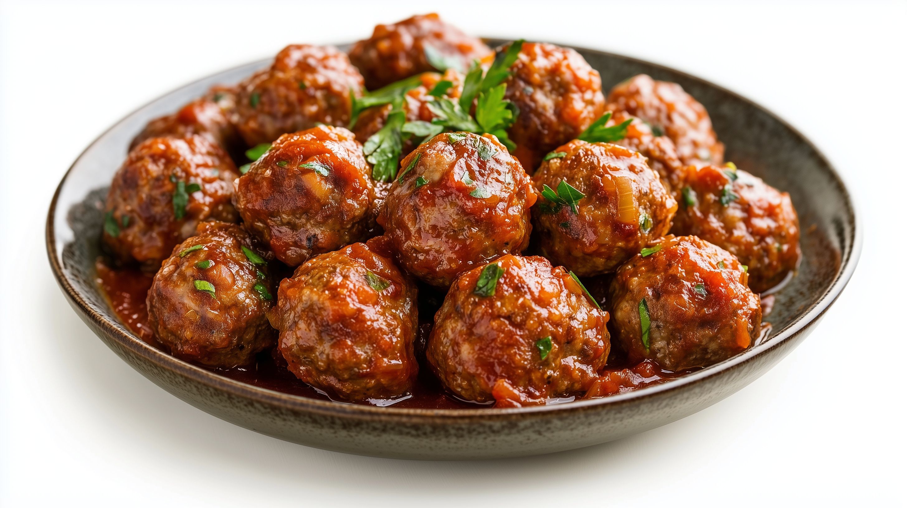 Diese saftigen Fleischbällchen in einer würzigen Tomatensauce sind ein köstliches und einfaches Gericht, das perfekt für Mittag- oder Abendessen geeignet ist. Die roten, glänzenden Bällchen liegen in einer reichhaltigen Sauce, garniert mit frischen grünen Kräutern. Das Bild zeigt die Speise in einer rustikalen Schüssel, was den authentischen, hausgemachten Charakter unterstreicht. Dieses hochwertige, lizenzfreie Stockfoto in hoher Auflösung kann ideal für Blogs, Social-Media-Kanäle, Kochbücher oder Werbematerialien eingesetzt werden und steht unter einer Creative-Commons-Lizenz zur Verfügung.