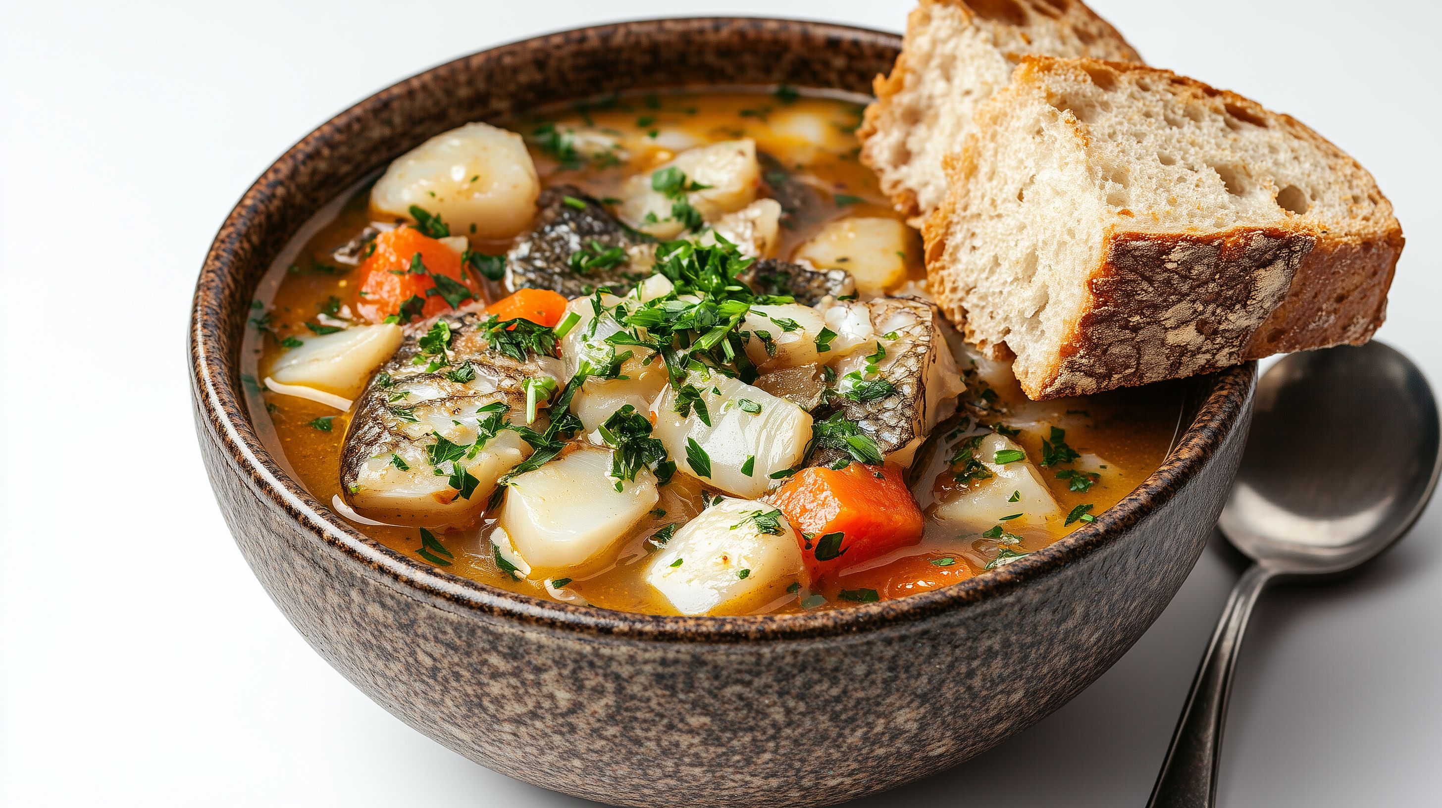 Herzhafte Fischsuppe mit Kartoffeln und Brot von Marco Verch unter Creative Commons 2.0