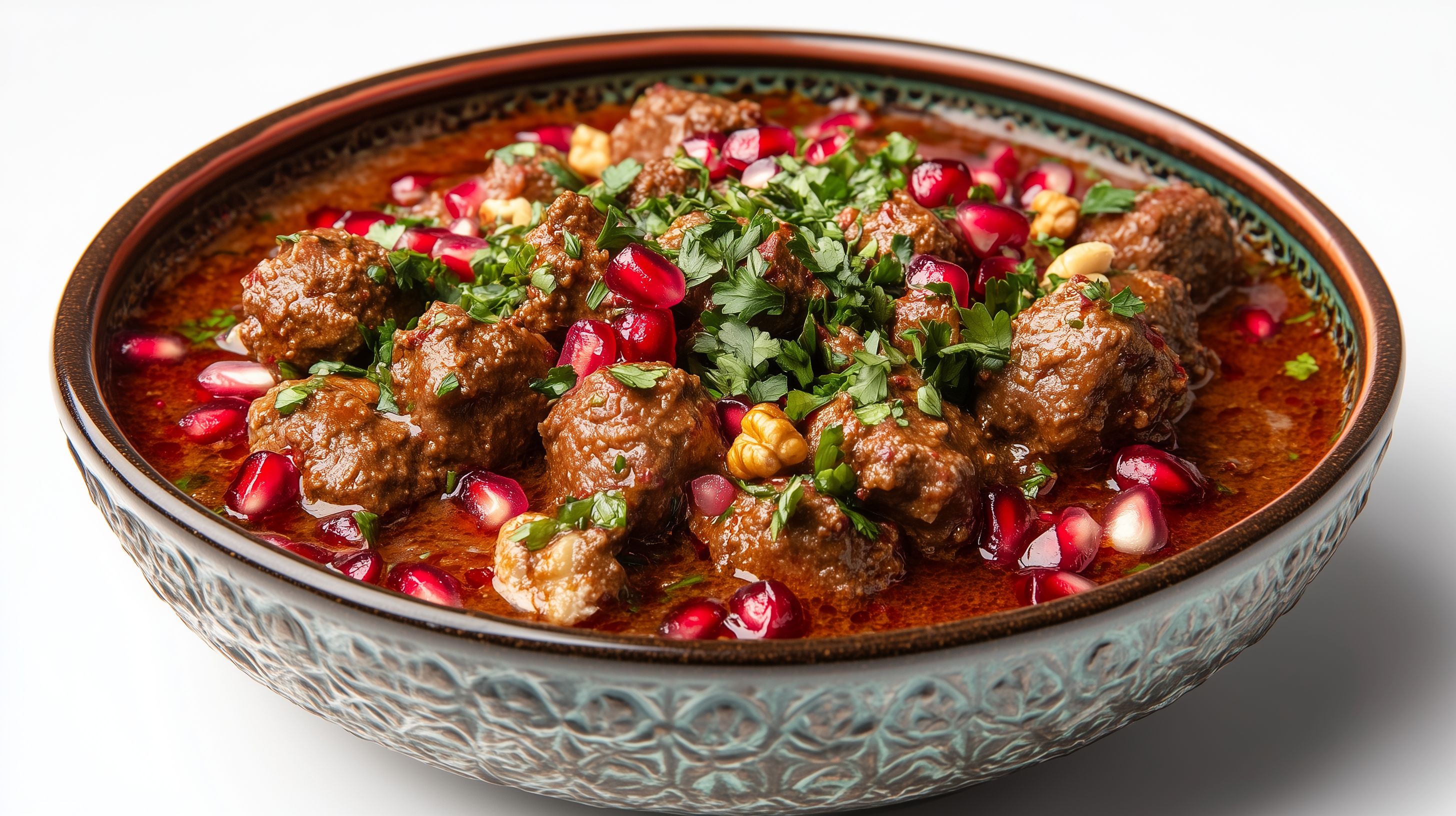 Dieses Foto zeigt ein appetitliches orientalisches Gericht, bestehend aus Fleischbällchen in einer würzigen Tomatensauce. Die Sauce ist mit frisch gehackter Petersilie und Granatapfelkernen garniert, was dem Gericht einen dekorativen und frischen Akzent verleiht. Die Zutaten sind in einer rustikalen Schüssel angerichtet, was dem Bild eine authentische und einladende Atmosphäre verleiht. Dieses Stockfoto in hoher Auflösung eignet sich hervorragend für die Verwendung in Blogs, Newslettern, Social-Media-Posts oder Werbematerialien zum Thema orientalische Küche, Fesenjan-Rezepte oder schmackhafte Fleischgerichte. Es steht unter einer Creative-Commons-Lizenz zur freien Nutzung zur Verfügung.