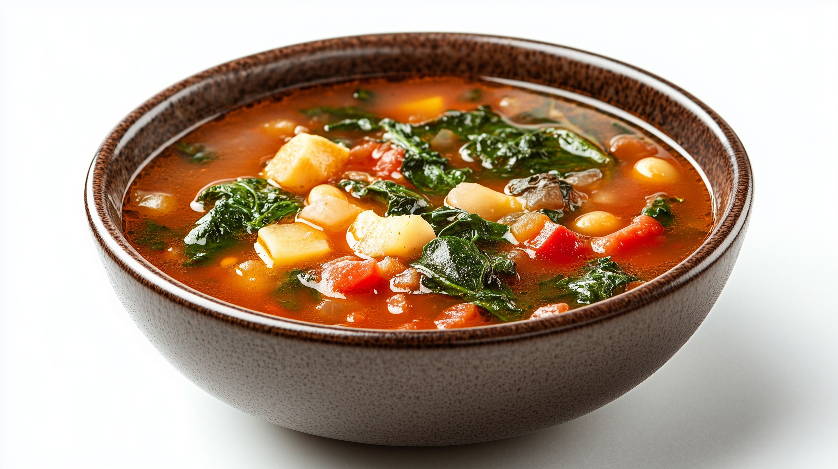 Diese Nahaufnahme zeigt eine köstliche, rustikale Gemüsesuppe in einer braunen Schüssel. Die Suppe ist gefüllt mit Kohl, Kartoffeln, Paprika und Tomaten, die ein lebendiges Rot-Orange-Farbspiel erzeugen. Die Zutaten sind in einer reichhaltigen Tomatensauce eingebettet, die der Suppe eine kräftige Farbe und ein appetitliches Aussehen verleiht. Dieses Foto eignet sich hervorragend als kostenloses Stockfoto für Blogs, Newsletter, Social-Media-Posts oder Werbematerialien zum Thema gesunde Ernährung, italienische Küche oder Rezeptideen. Die hohe Auflösung und die Creative-Commons-Lizenz ermöglichen eine flexible Verwendung.