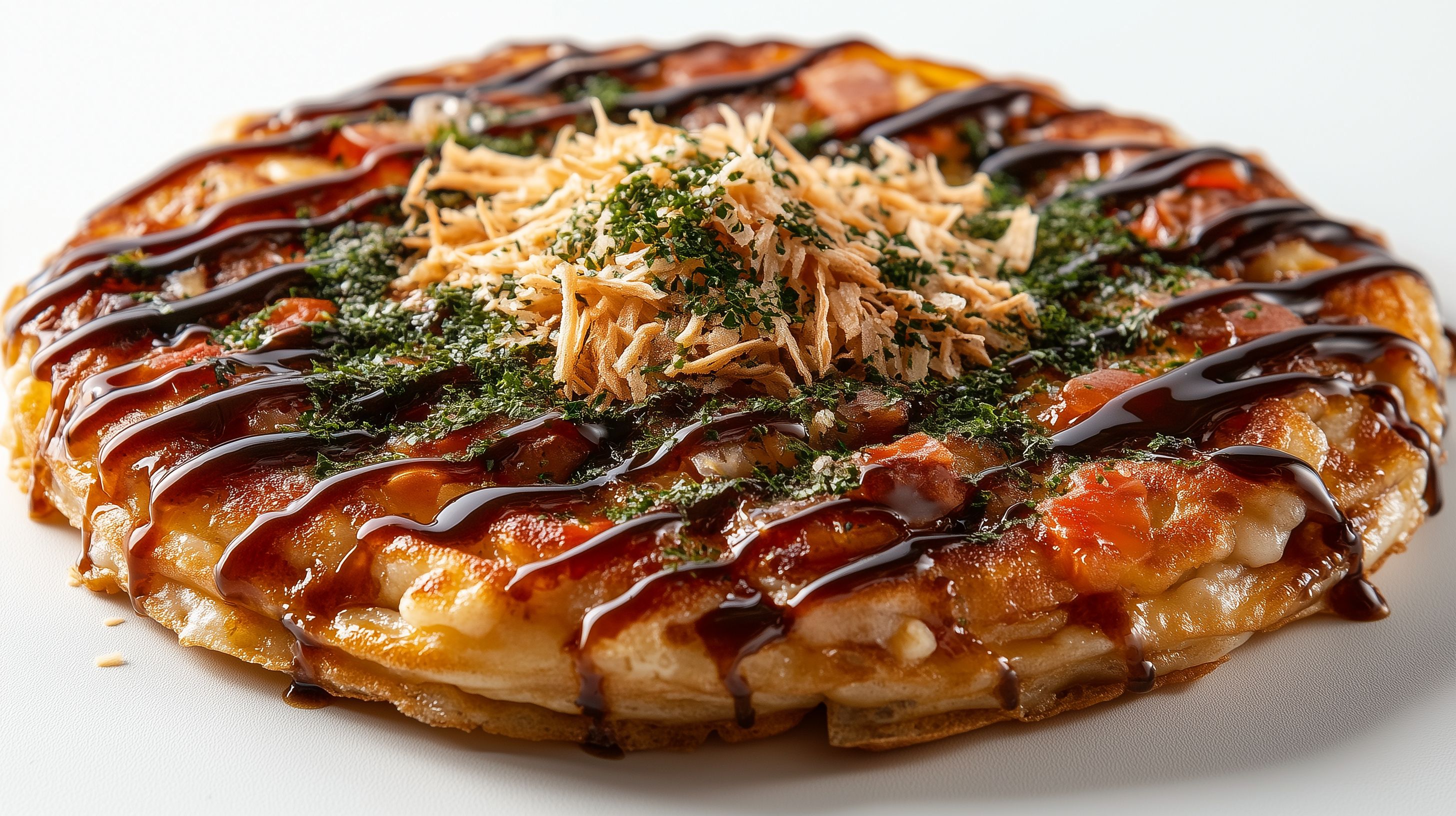 Das Bild zeigt einen appetitlichen Stapel traditioneller japanischer Okonomiyaki-Pfannkuchen. Die Pfannkuchen sind mit einer würzigen, saucenartigen Soße beträufelt und mit Bonito-Flocken, fein gehackten Seealgen und anderen Toppings garniert. Die Anordnung wirkt rustikal und authentisch, mit lebendigen Farben und einer köstlichen Optik, die zum Probieren einlädt. Dieses hochauflösende Stockfoto eignet sich hervorragend für Verwendungen in Blogs, Newslettern, Social-Media-Beiträgen oder Werbematerialien rund um japanische Küche, Streetfood und authentische Lebensmittelfotos. Es steht unter einer Creative-Commons-Lizenz zum kostenlosen Download zur Verfügung.