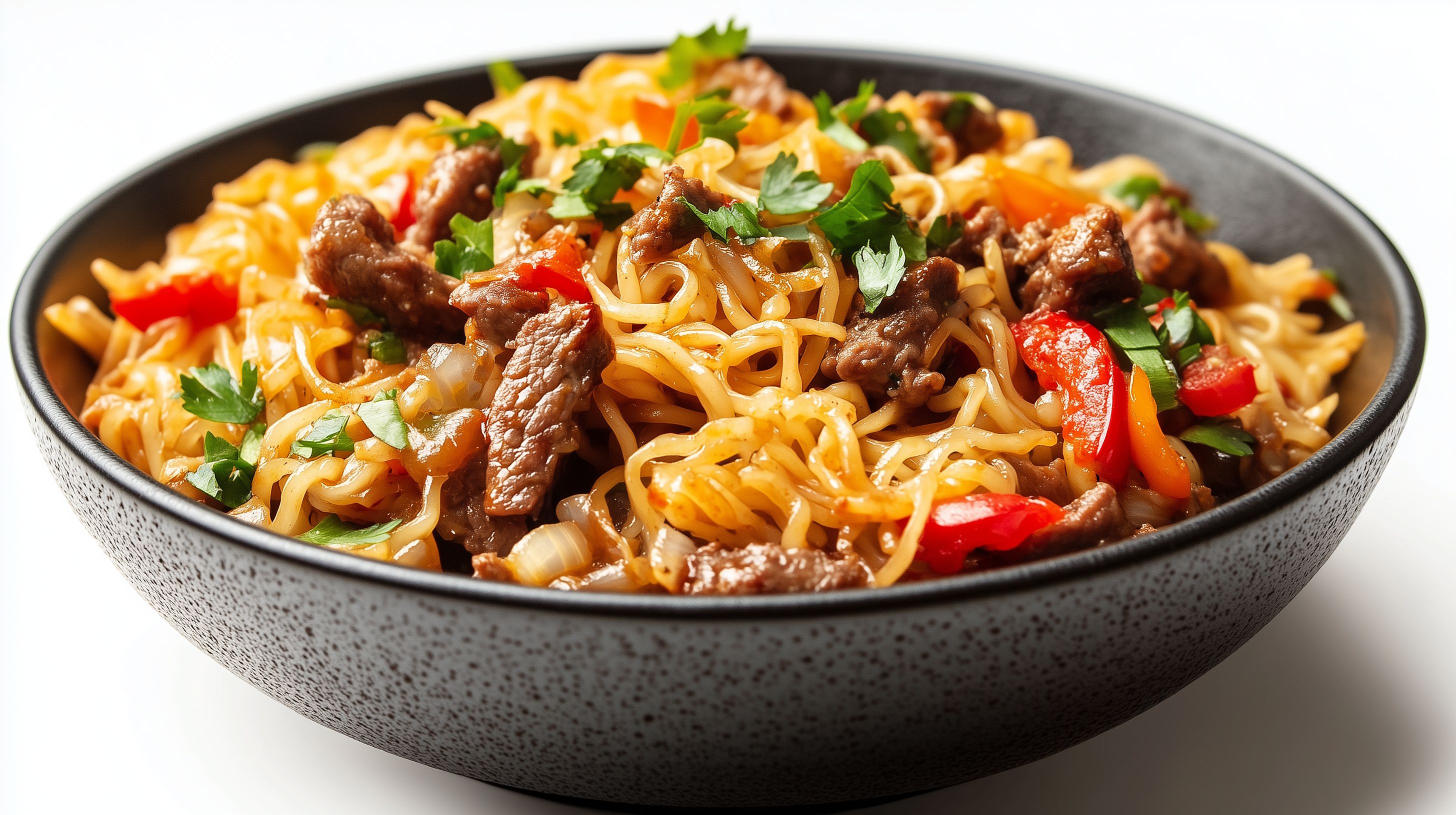 Dieses Foto zeigt ein schmackhaftes kasachisches Nudelgericht namens Beshbarmak. Es besteht aus frischen Nudeln, würzigem Fleisch, buntem Gemüse wie Paprika und Lauch sowie einem Hauch von Kräutern. Das Gericht ist in einer rustikalen, dunklen Schüssel angerichtet und wirkt äußerst appetitlich. Mit seinen kräftigen Farben, der klaren Komposition und dem Fokus auf das Hauptgericht ist dieses Stockfoto ideal für den Einsatz in Gastro-Blogs, Restaurantwebsites oder Social-Media-Posts rund um kulinarische Themen. Als hochwertiges, kostenloses Foto unter Creative-Commons-Lizenz steht es allen zur Verfügung.