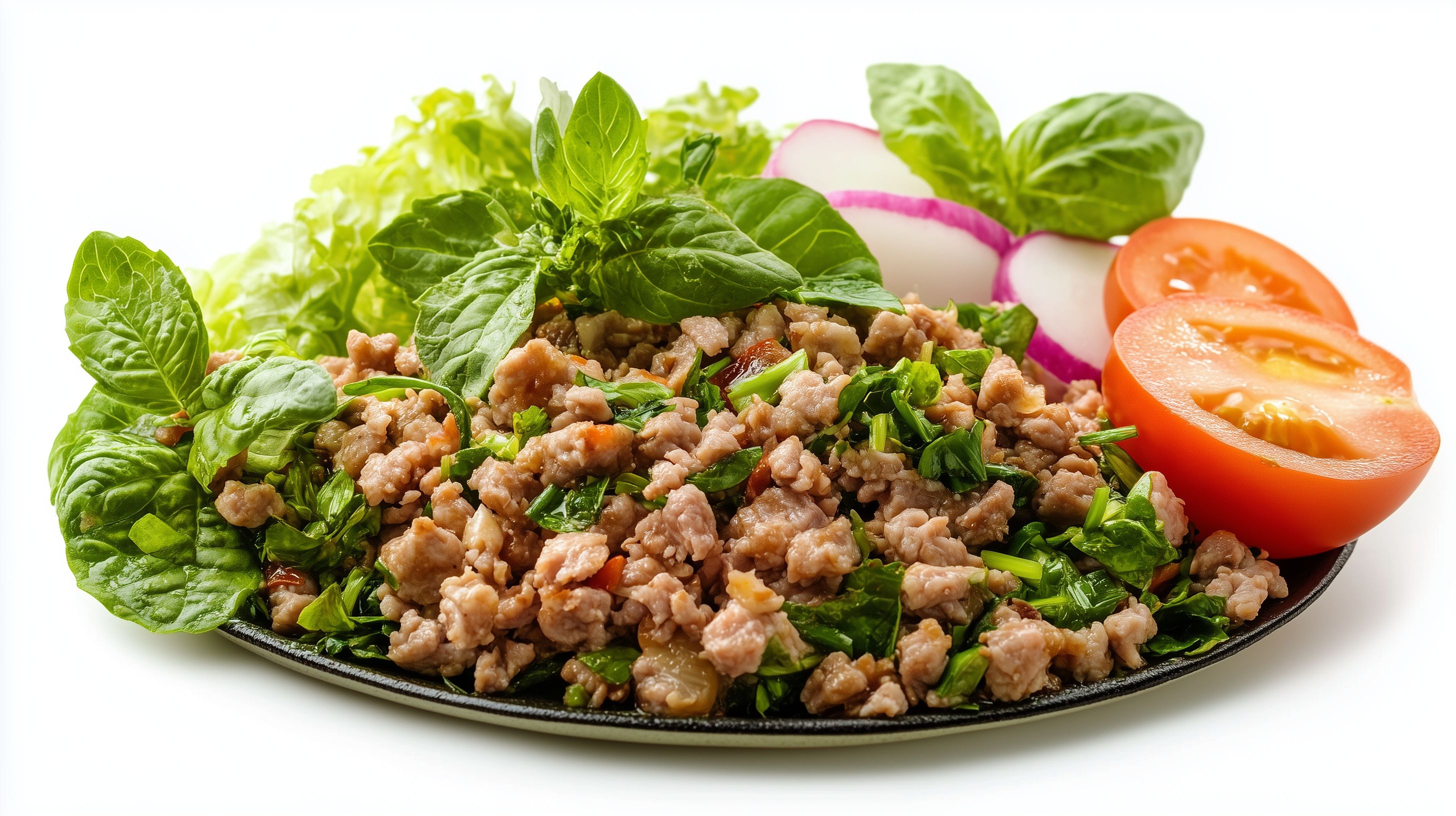 Dieses Foto zeigt einen leckeren Fleischsalat, der mit frischen grünen Blättern, Kräutern wie Minze und Basilikum sowie Gemüse wie Radieschen und Tomaten angerichtet ist. Das Gericht präsentiert sich in einer rustikalen Schüssel vor weißem Hintergrund. Die farbenfrohe und appetitliche Kombination aus den saftig-würzigen Zutaten verspricht ein gesundes und schmackhaftes Mittagessen oder Abendessen. Dieses hochwertige Stockfoto eignet sich perfekt für die Verwendung in Blogs, Newslettern, Social-Media-Beiträgen oder Werbekampagnen rund um das Thema Ernährung und gesunde Küche.