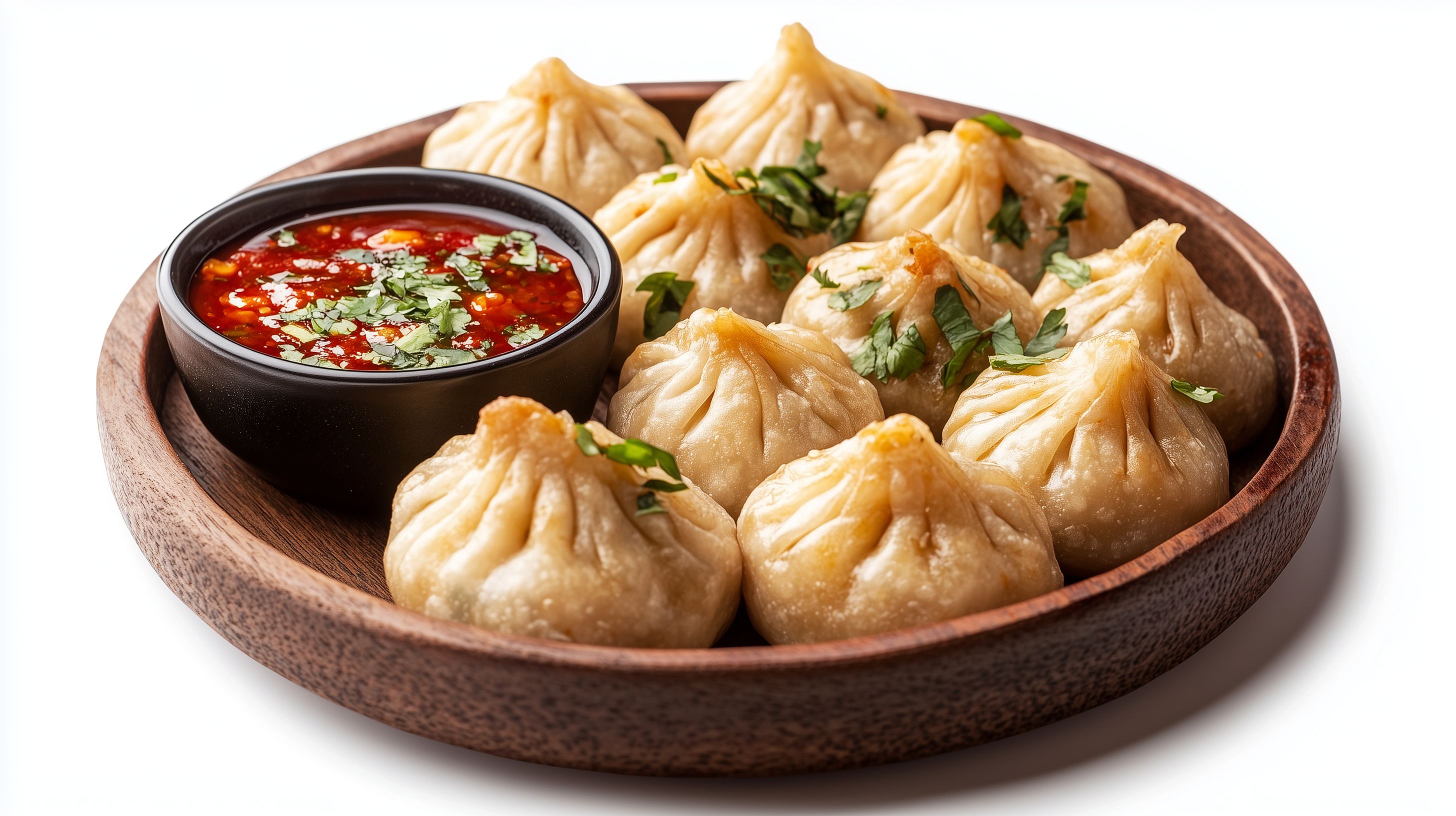 Dieses Foto zeigt eine Schale voller nepalesischer Teigtaschen namens Momos, die auf einem rustikalen Holzteller angerichtet sind. Die goldbraunen Teigtaschen sind mit einer würzigen, roten Dip-Sauce serviert, die einen schönen Farbkontrast bietet. Das Gericht ist traditionell in der nepalesischen Küche und wird oft als Appetizer oder leichte Mahlzeit gereicht. Das Foto eignet sich hervorragend als hochwertiges Stockfoto für Beiträge über asiatische Küche, traditionelle Gerichte oder kulinarische Fotografie. Das Bild ist in hoher Auflösung und unter Creative-Commons-Lizenz verfügbar.