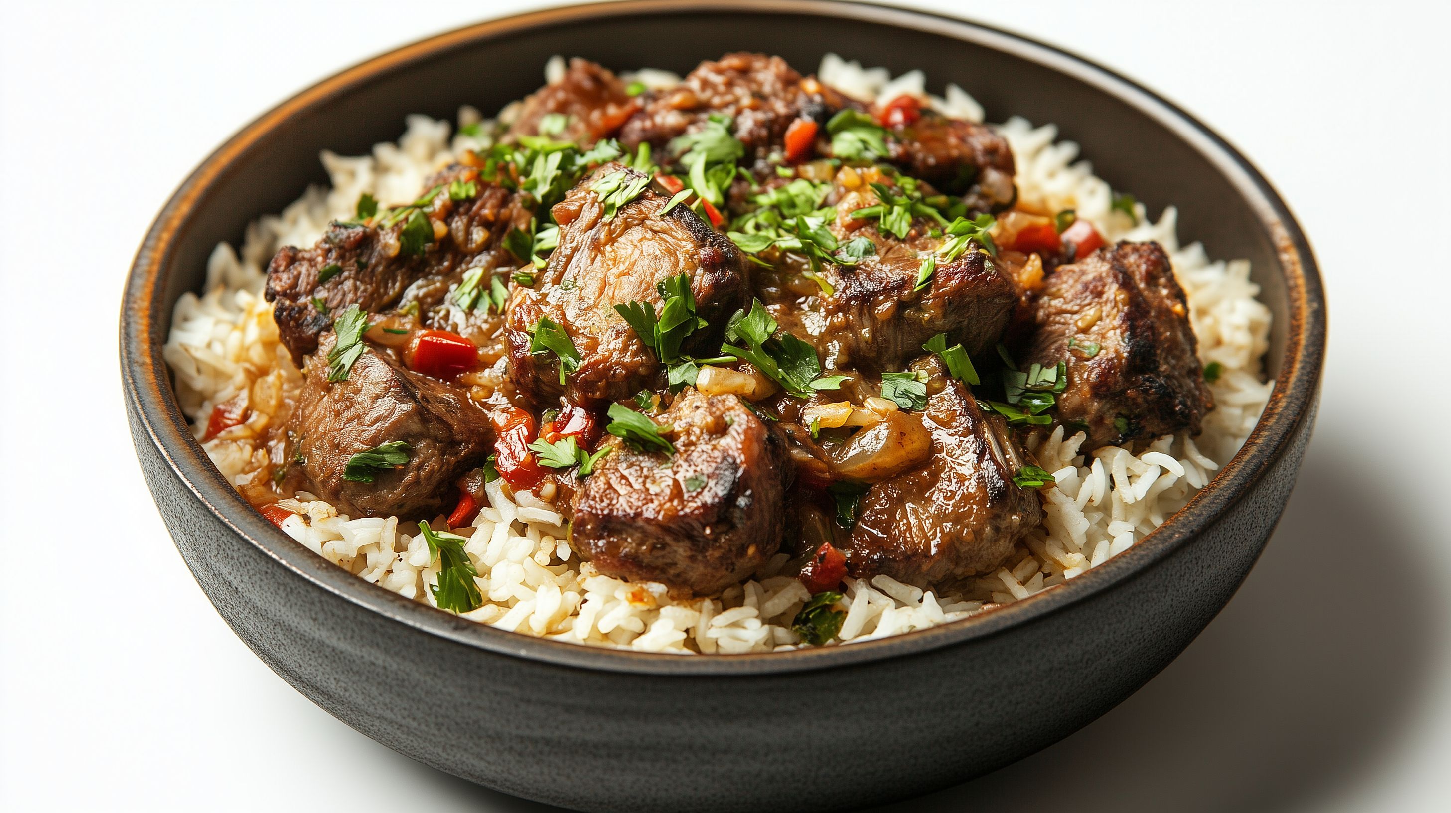 Dieses Foto zeigt ein schmackhaftes orientalisches Lamm-Curry, das auf einem Bett von dampfenden weißen Reis serviert wird. Das Gericht ist in einer rustikalen dunklen Keramikschale angerichtet und mit frischen Kräutern garniert. Die Soße ist dunkel und reichhaltig und enthält Stücke von zart geschmortem Lammfleisch sowie Gemüsestreifen. Die Farbpalette ist warm und einladend, mit Tönen von Braun, Rot und Grün. Dieses Foto eignet sich hervorragend für die Verwendung in Blogs, Newslettern oder Social-Media-Beiträgen, die sich um gesunde, authentische Küche oder internationale Gerichte drehen. Als kostenloses Stockfoto in hoher Auflösung und unter Creative-Commons-Lizenz kann es problemlos in verschiedenen kommerziellen und redaktionellen Kontexten eingesetzt werden.