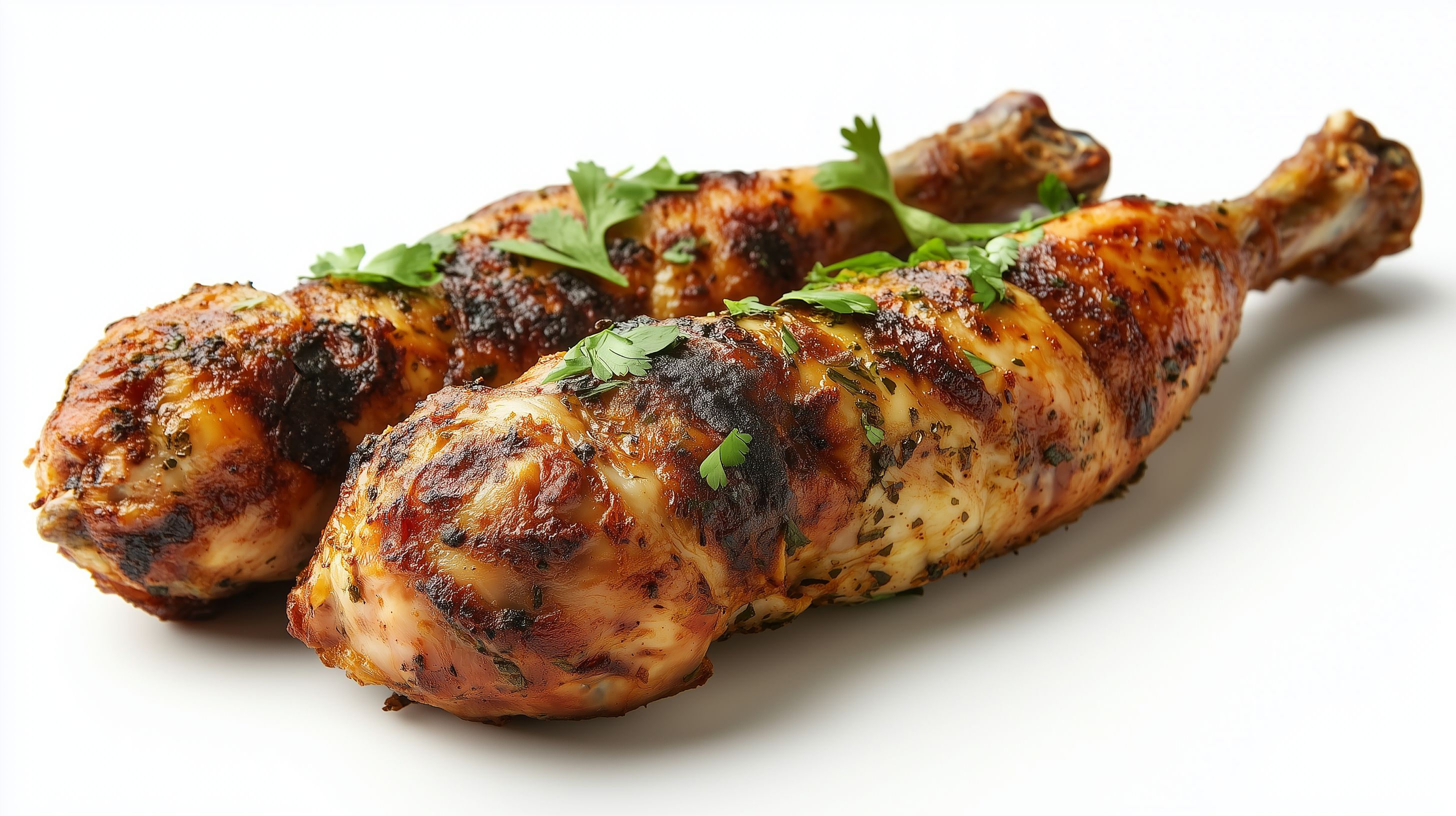 Dieses Foto zeigt knusprig gegrillte Hühnerschenkel, die mit frischen Kräutern dekoriert sind. Die Haut der Hühnchen ist schön gebräunt und die Fleischstücke sehen saftig und aromatisch aus. Das Arrangement auf dem weißen Hintergrund erzeugt einen appetitanregenden und klassischen Eindruck, der sich hervorragend für Foodfotografie, Restaurant-Websites, Kochbücher oder Werbung für Grillsaison und Outdoor-Küche eignet. Als kostenloses Stockfoto in hoher Auflösung und unter Creative-Commons-Lizenz verfügbar, ist dieses Bild eine großartige visuelle Ressource für vielfältige Anwendungen.