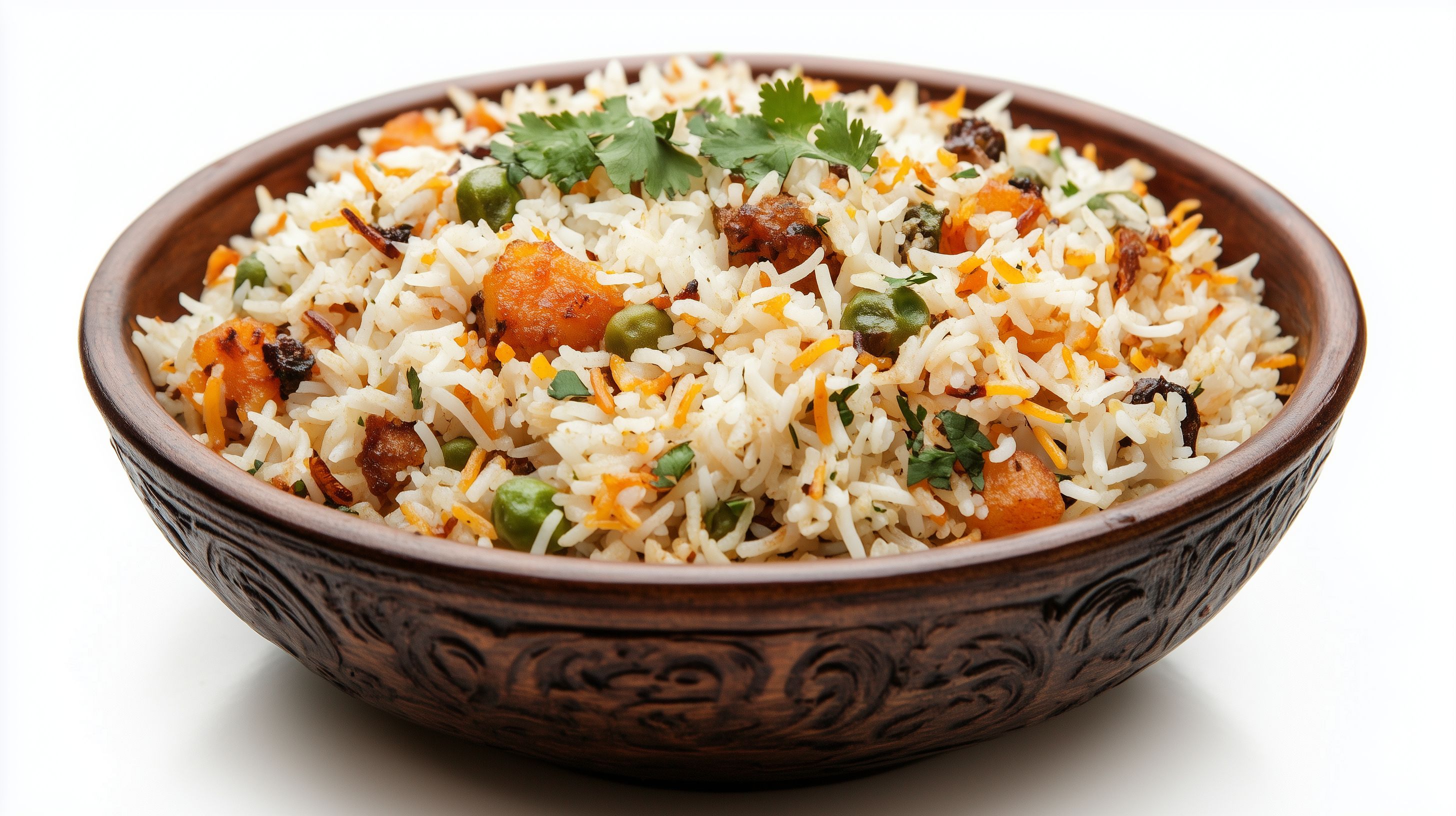 Das Bild zeigt eine üppige Portion eines traditionellen indischen Hyderabadi Biryani-Reiseintopfs in einer rustikalen, verzierten Schüssel. Der Reis ist mit verschiedenen Gemüsesorten, Gewürzen und Kräutern wie Karotten, Erbsen und Koriander vermischt, was eine appetitliche Optik und ein leckeres Aroma verspricht. Die Komposition und die Farbpalette in Erdtönen verleihen dem Gericht einen authentischen, orientalischen Charakter. Dieses kostenlose Stockfoto in hoher Auflösung eignet sich hervorragend für Kochrezepte, Reise- und Ernährungsblogs, asiatische Restaurantwerbung oder Menügestaltung unter einer Creative-Commons-Lizenz.