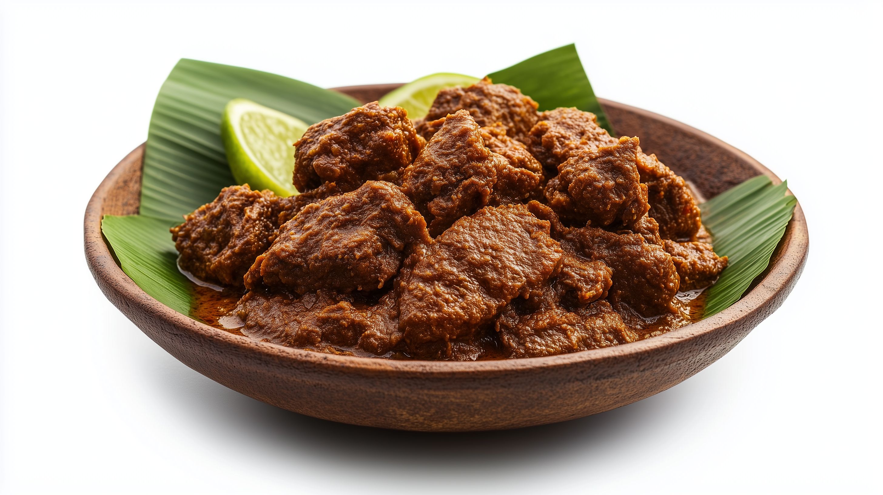Dieses Foto zeigt ein traditionelles indonesisches Rendang-Gericht, serviert in einer rustikalen Holzschale. Das dunkle, würzige Fleisch ist mit grünen Bananenblättern und frischer Zitrone dekoriert, was einen appetitlichen und authentischen Eindruck vermittelt. Das Bild eignet sich hervorragend für die Verwendung in Kochrezepten, Restaurantmenüs, Reiseberichten oder Artikeln über asiatische Küche. Als hochwertiges, kostenloses Stockfoto in Creative-Commons-Lizenz kann es flexibel in verschiedenen Kontexten eingesetzt werden.