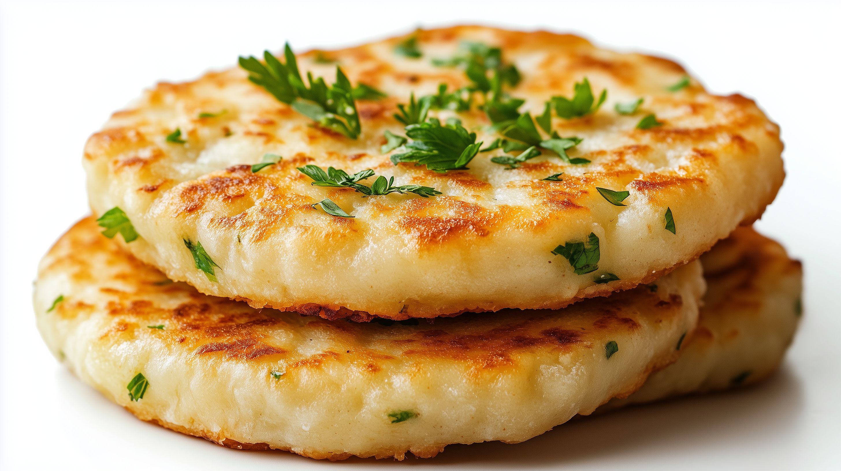 Das Bild zeigt zwei frisch zubereitete irische Boxty-Kartoffelpuffer, die auf einem weißen Hintergrund platziert sind. Die Puffer haben eine goldbraune, knusprige Oberfläche und sind mit frischen, grünen Kräutern wie Petersilie dekoriert, was ihnen einen appetitlichen Eindruck verleiht. Boxty ist ein traditionelles irisches Gericht, das aus geriebenen, gekochten Kartoffeln hergestellt wird und oft als Beilage oder Snack serviert wird. Dieses hochauflösende Stockfoto eignet sich perfekt für die Verwendung in Blogs, Newslettern, Social-Media-Beiträgen oder Werbematerialien rund um die irische Küche, gesunde Ernährung oder traditionelle Gerichte. Das Bild ist unter einer Creative-Commons-Lizenz verfügbar und kann daher kostenfrei genutzt werden.