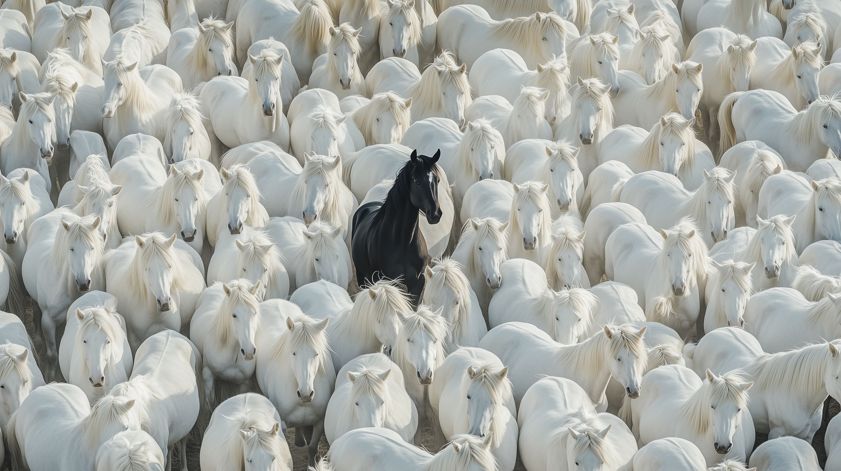 Dieses eindrucksvolle Foto zeigt eine Herde weißer Pferde, die von einem einzelnen, schwarzen Pferd durchbrochen wird. Der starke Kontrast zwischen den hellen und dunklen Tieren ist visuell sehr reizvoll und gibt dem Bild eine besondere Dynamik. Die Pferde sind in einer natürlichen Umgebung abgebildet, was eine friedliche und offene Stimmung vermittelt.