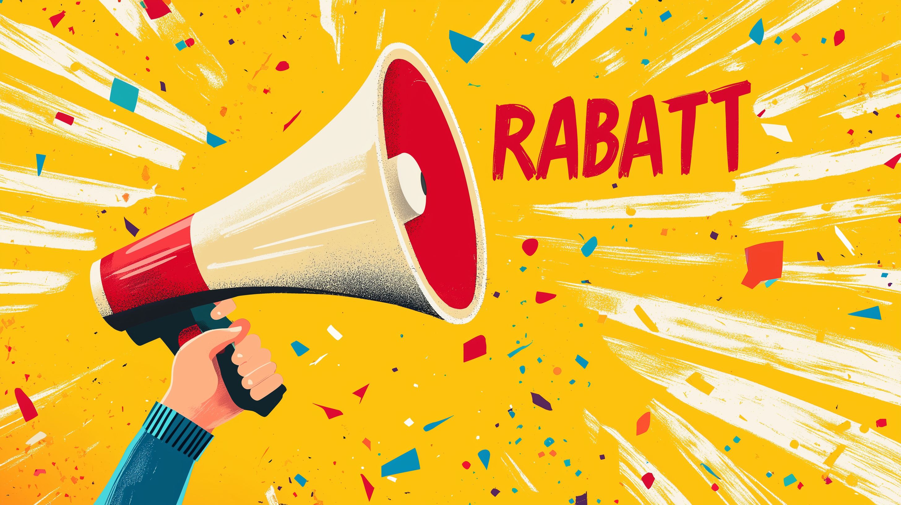 Diese digitale Illustration zeigt eine dynamische Szene mit einem roten Megafon, das von einer Hand gehalten wird, vor einem leuchtend gelben Hintergrund. Um das Megafon herum explodieren bunte Konfettistücke, die eine farbenfrohe und energiegeladene Atmosphäre schaffen. Das Bild vermittelt den Eindruck einer Rabattankündigung oder Werbeaktion, die die Aufmerksamkeit des Betrachters auf sich ziehen soll. Die kontrastreichen Farben, die dynamische Komposition und die symbolhafte Darstellung machen dieses Foto zu einem idealen Eyecatcher für Blog-Beiträge, Newsletter-Designs, Social-Media-Posts oder Werbematerialien. Als kostenloses Stockfoto in hoher Auflösung und unter Creative-Commons-Lizenz eignet es sich hervorragend für eine Vielzahl von Projekten und Kampagnen.