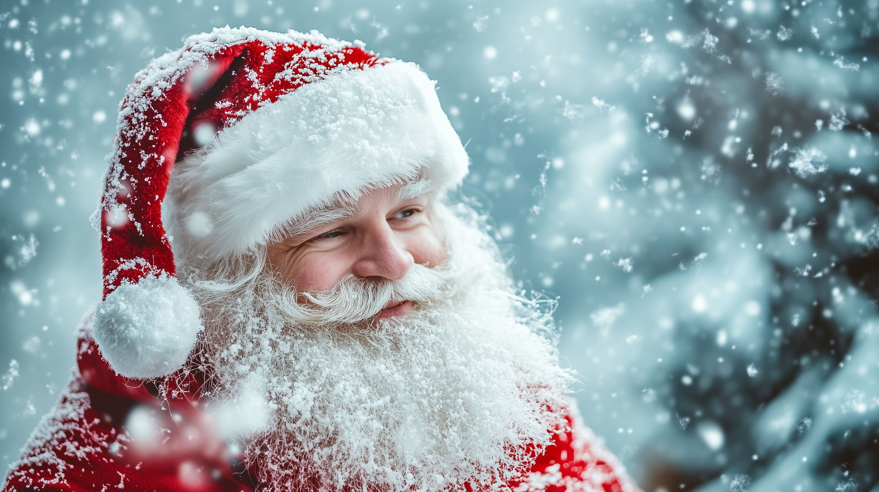 Dieses festliche Winterwonder-Stockfoto zeigt einen Weihnachtsmann mit weißem Rauschebart und roter Mütze, der inmitten eines verschneiten Waldes steht. Er lächelt fröhlich in die Kamera, während Schneeflocken in der Luft wirbeln. Das hochauflösende Bild eignet sich hervorragend für Weihnachtsgrüße, Werbekampagnen, Blogbeiträge und Social-Media-Postings rund um die Feiertage. Das Foto ist unter der Creative-Commons-Lizenz frei nutzbar.