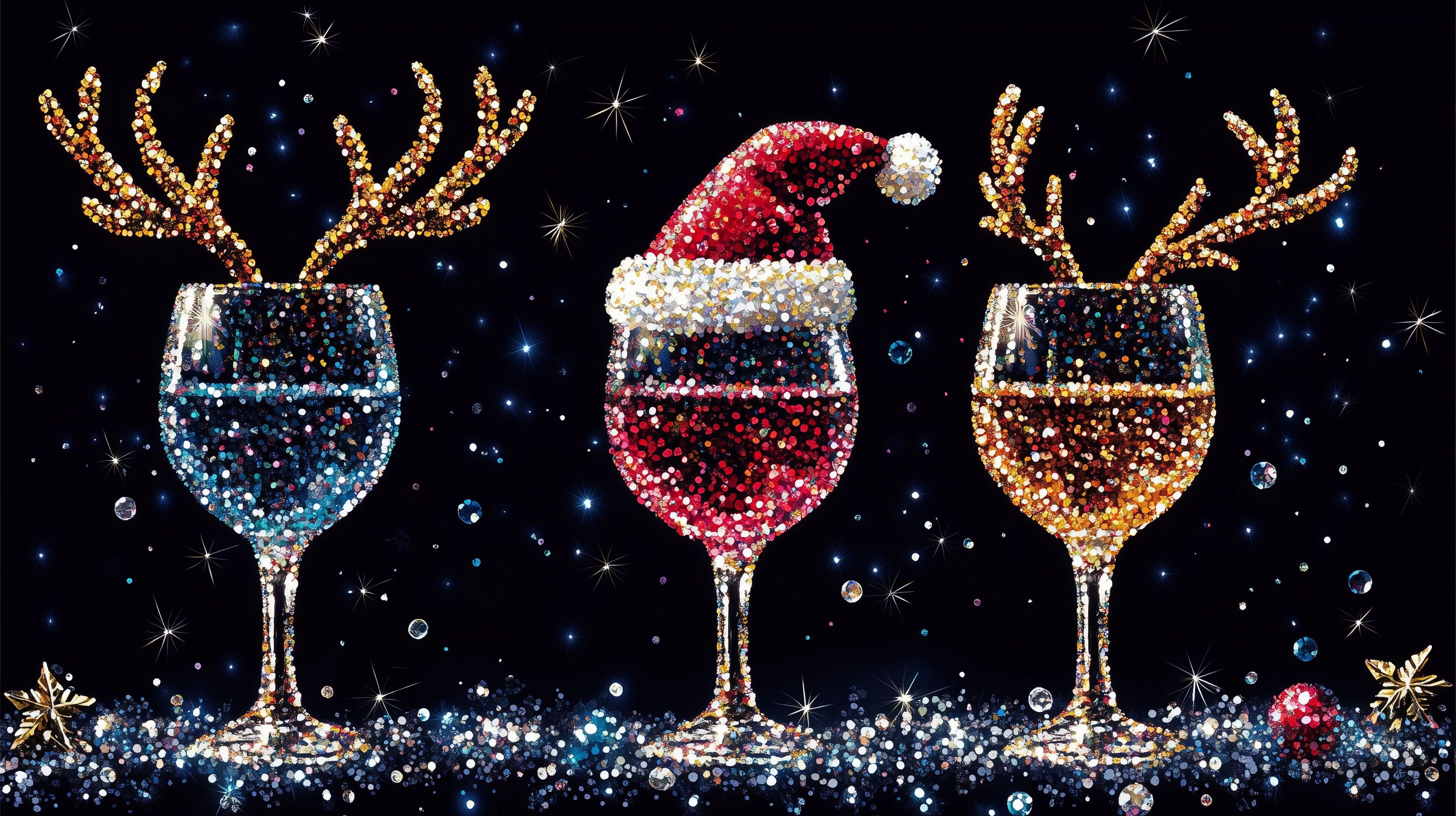 Dieses funkelnde Weihnachtsbild zeigt drei prächtig geschmückte Weingläser vor einem dunklen Nachthimmel voller Sterne und Glitzer. Die Gläser sind mit Pailletten und Glitzer verziert und tragen jeweils ein Rentiergeweih sowie eine Weihnachtsmütze. Die farbenfrohe und festliche Komposition strahlt Feiertagsstimmung und Weihnachtszauber aus. Dieses hochauflösende Stockfoto eignet sich hervorragend für Weihnachtsgrüße, Feiertagsdekorationen, Werbung und andere Weihnachtsmedien. Es steht unter einer kostenlosen Creative-Commons-Lizenz zum Download bereit.
