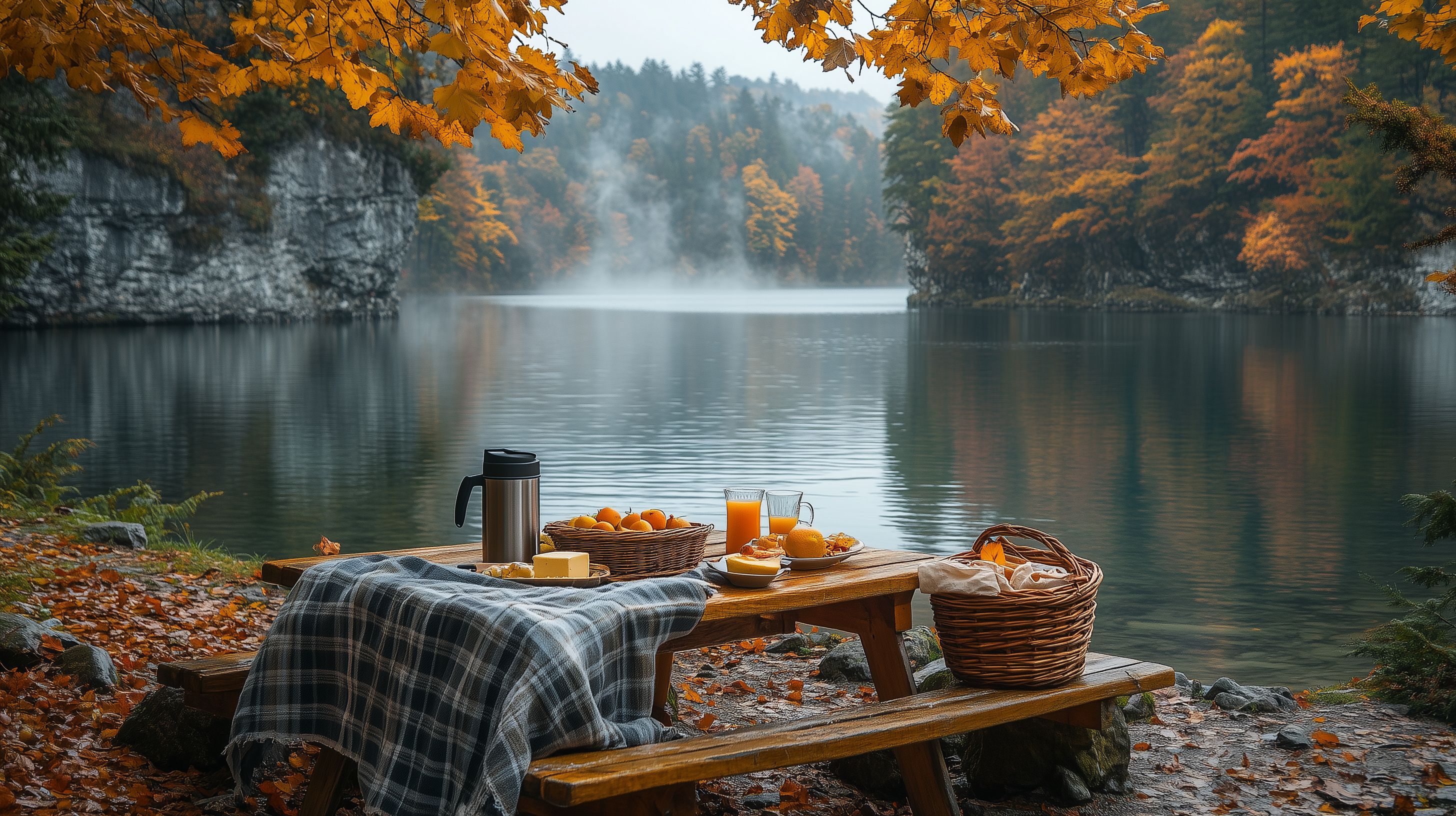 Dieses stimmungsvolle Foto zeigt ein herbstliches Picknick an einem idyllischen See. Im Vordergrund befindet sich ein rustikaler Holztisch mit einer Decke, einem Korb voller Früchte und einer Thermoskanne. Durch die orange-gelben Blätter der Bäume um den See entsteht eine wunderbare Farbharmonie. Der Nebel, der über dem ruhigen Wasser liegt, verleiht der Szene eine geheimnisvolle Atmosphäre. Dieses kostenlose Stockfoto in hoher Auflösung lässt sich wunderbar für Blogs, Newsletter, Social Media-Posts oder Werbekampagnen rund um das Thema Herbst, Natur und Entspannung einsetzen. Es steht unter einer Creative Commons-Lizenz zur freien Verwendung zur Verfügung.