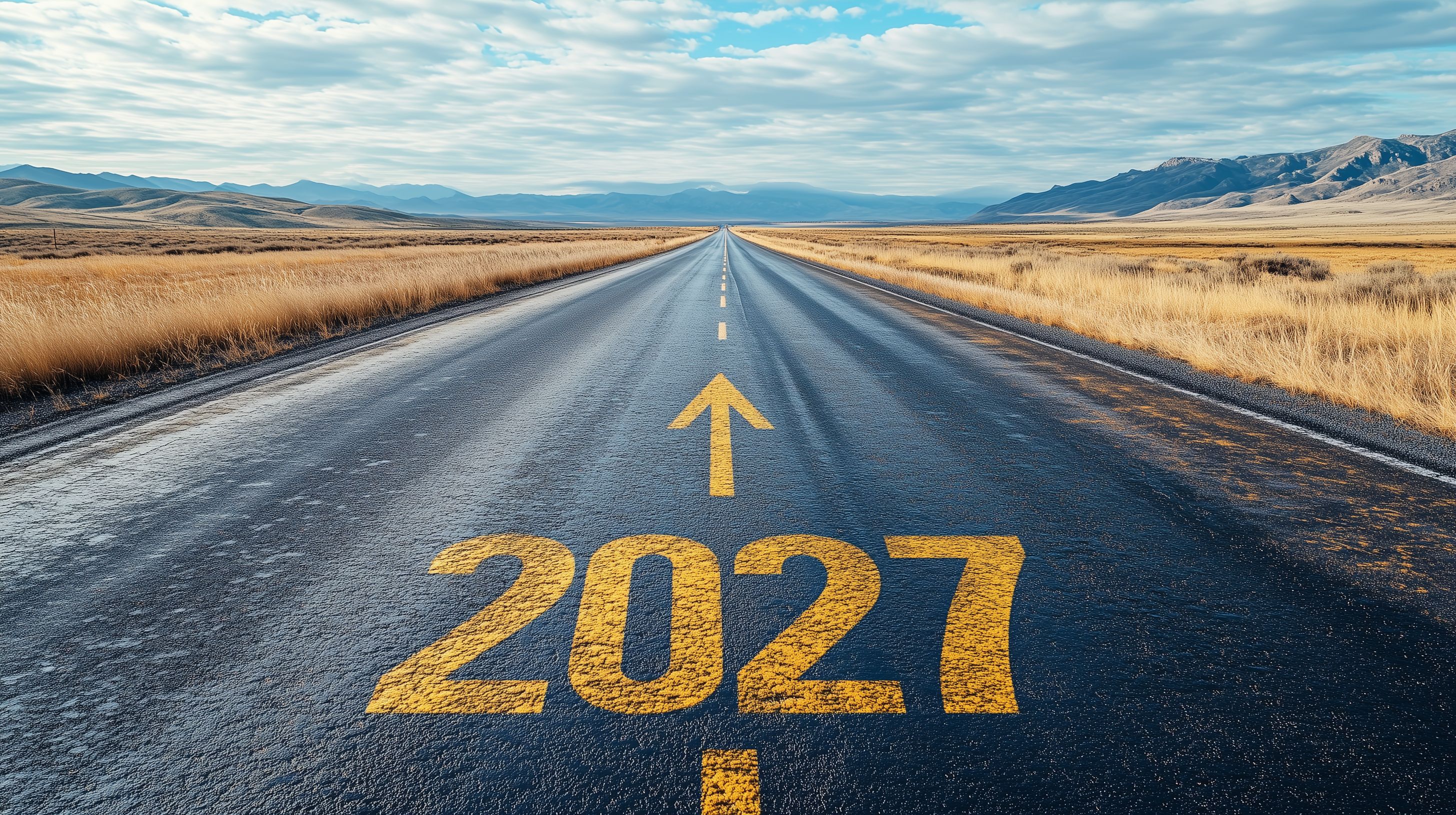 Dieses beeindruckende Foto zeigt eine endlos erscheinende Straße, die sich durch eine weite, trockene Landschaft schlängelt. Am Horizont zeichnen sich majestätische Bergketten ab, während der Himmel von Wolken durchzogen ist. Auf der Straße selbst ist in großen, gelben Ziffern die Jahreszahl 2027 zu sehen, die als Wegweiser in die Zukunft dient. Das Bild vermittelt ein Gefühl von Weite, Freiheit und Aufbruch - perfekt geeignet für Blog-Beiträge, Newsletter-Gestaltung oder Social-Media-Postings rund um Themen wie Mobilität, Reisen und Zukunftsvisionen. Als kostenloses Stockfoto in hoher Auflösung und unter Creative-Commons-Lizenz steht es Ihnen für vielfältige Verwendungszwecke zur Verfügung.