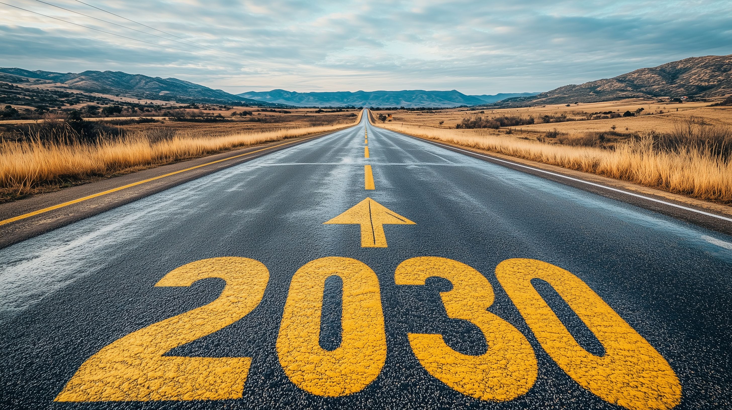 Dieses beeindruckende Foto zeigt eine einsame Landstraße, die sich in die Ferne erstreckt. Die Straße verläuft durch eine weite, ländliche Landschaft mit Hügeln und Bergen im Hintergrund. Auffallend sind die großen, gelben Zahlen '2030' auf der Straße, die wie ein Symbol für die Zukunft und den Fortschritt erscheinen. Das Bild erzeugt eine Stimmung von Weite, Ruhe und Perspektive. Es eignet sich hervorragend als kostenloses Stockfoto für Blogbeiträge, Social-Media-Kanäle oder Werbematerialien mit Themen wie Zukunft, Entwicklung, Reise oder Landschaft. Die hochwertige Auflösung und Creative-Commons-Lizenz ermöglichen eine flexible Nutzung.