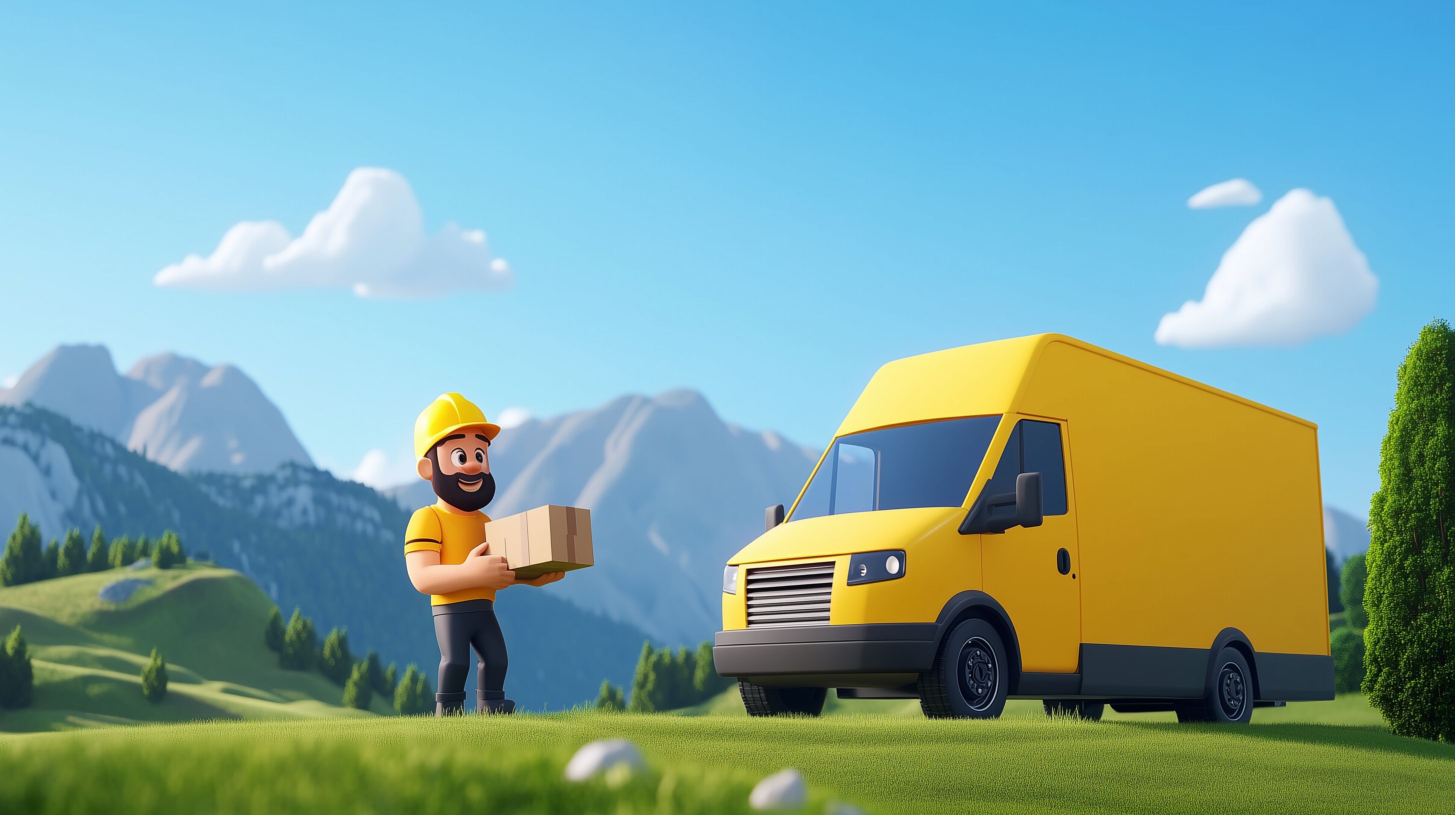 Das Bild zeigt einen Paketzusteller in einer idyllischen Berglandschaft. Der Mann in gelbem Outfit trägt eine Kiste und steht vor einem gelben Lieferwagen, der in einer grünen, hügeligen Umgebung geparkt ist. Im Hintergrund sind schneebedeckte Berggipfel und blauer Himmel mit Wolken zu sehen. Das Foto vermittelt eine friedliche, ländliche Stimmung und könnte für Beiträge zu Themen wie Logistik, Lieferservice oder Online-Shopping verwendet werden. Als kostenloses Stockfoto in hoher Auflösung unter Creative-Commons-Lizenz ist es für vielfältige Zwecke einsetzbar.