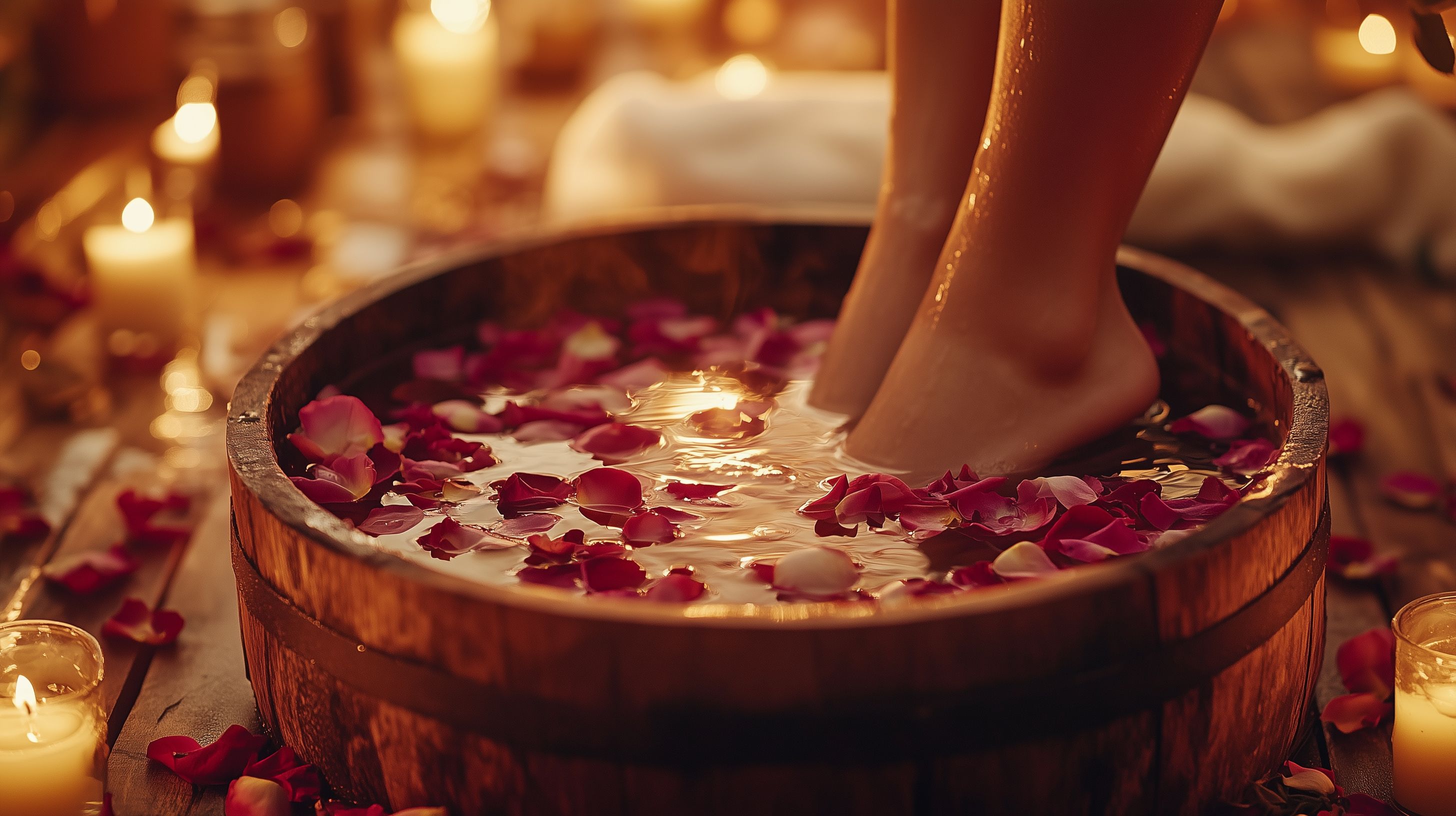 Das Foto zeigt ein entspannendes Fußbad in einer rustikalen Holzschale. Die Schale ist mit dunkelroten Rosenblüten und Kerzen dekoriert, die ein warmes, gemütliches Licht verbreiten. Das Wasser schimmert leicht und lässt die Füße in einem friedlichen Moment der Ruhe und Erholung eintauchen. Dieses stimmungsvolle Bild eignet sich hervorragend als kostenloses Stockfoto für Blogs, Newsletter, Social-Media-Beiträge oder Werbematerialien rund um die Themen Entspannung, Wellness und Hautpflege. Die hochauflösende Datei steht unter einer Creative-Commons-Lizenz zur Verfügung.