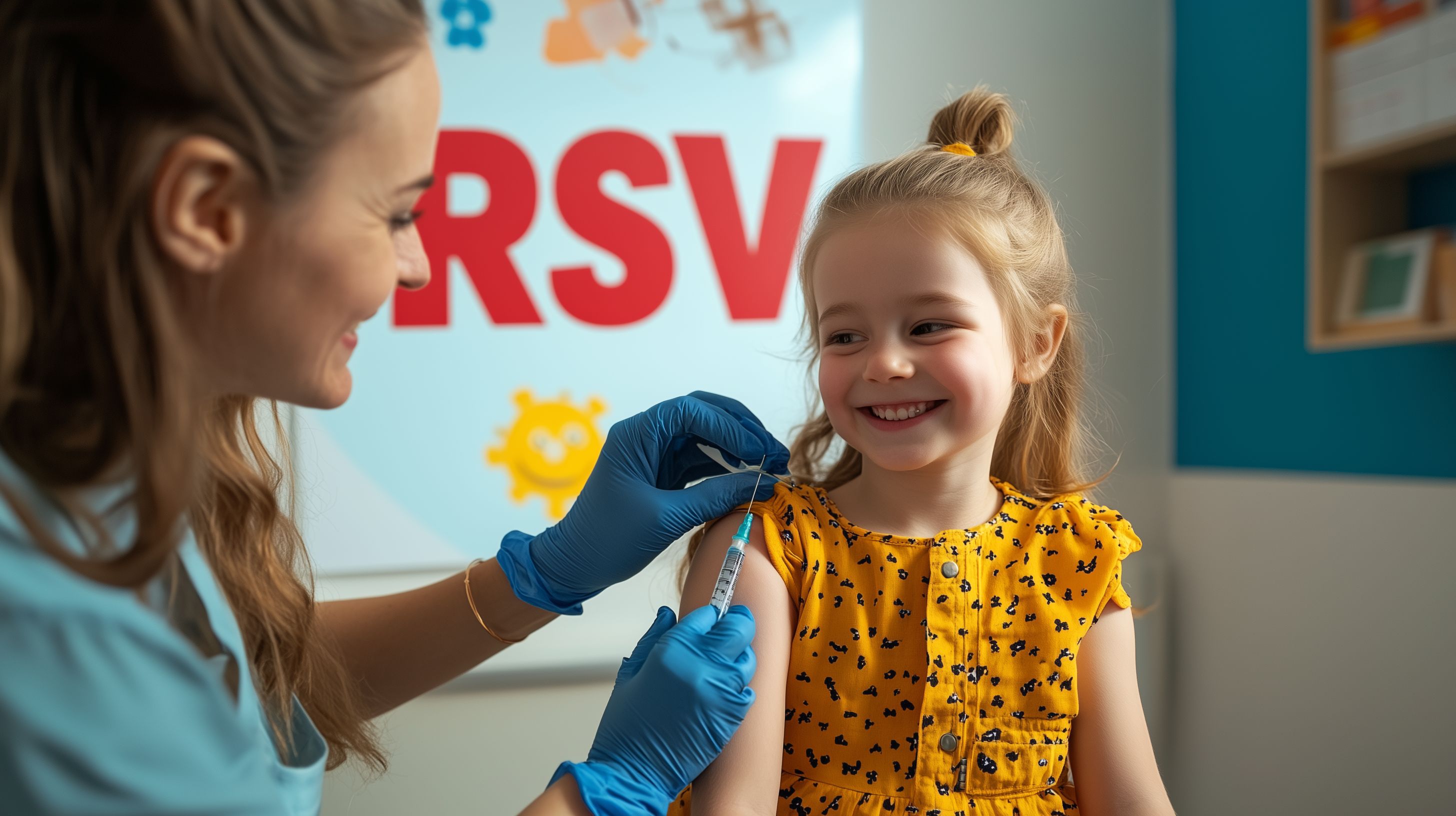 Das Bild zeigt ein fröhliches, lächelndes Mädchen, das eine RSV-Impfung in einer Arztpraxis oder Klinik erhält. Die Ärztin oder Krankenschwester in blauem Schutzhandschuh verabreicht dem Kind liebevoll die Impfung. Im Hintergrund ist ein Schild mit dem RSV-Logo zu sehen, das die medizinische Einrichtung kennzeichnet. Das Foto vermittelt einen positiven, vertrauensvollen Eindruck der Impfung und unterstreicht die Wichtigkeit von Prävention und Schutz gegen Atemwegsinfektionen wie RSV, besonders bei Kindern. Dieses hochauflösende, kostenlose Stockfoto eignet sich hervorragend für Blogs, Newsletter, Social-Media-Beiträge oder Werbematerial rund um das Thema Gesundheitsvorsorge und Kinderimpfungen.