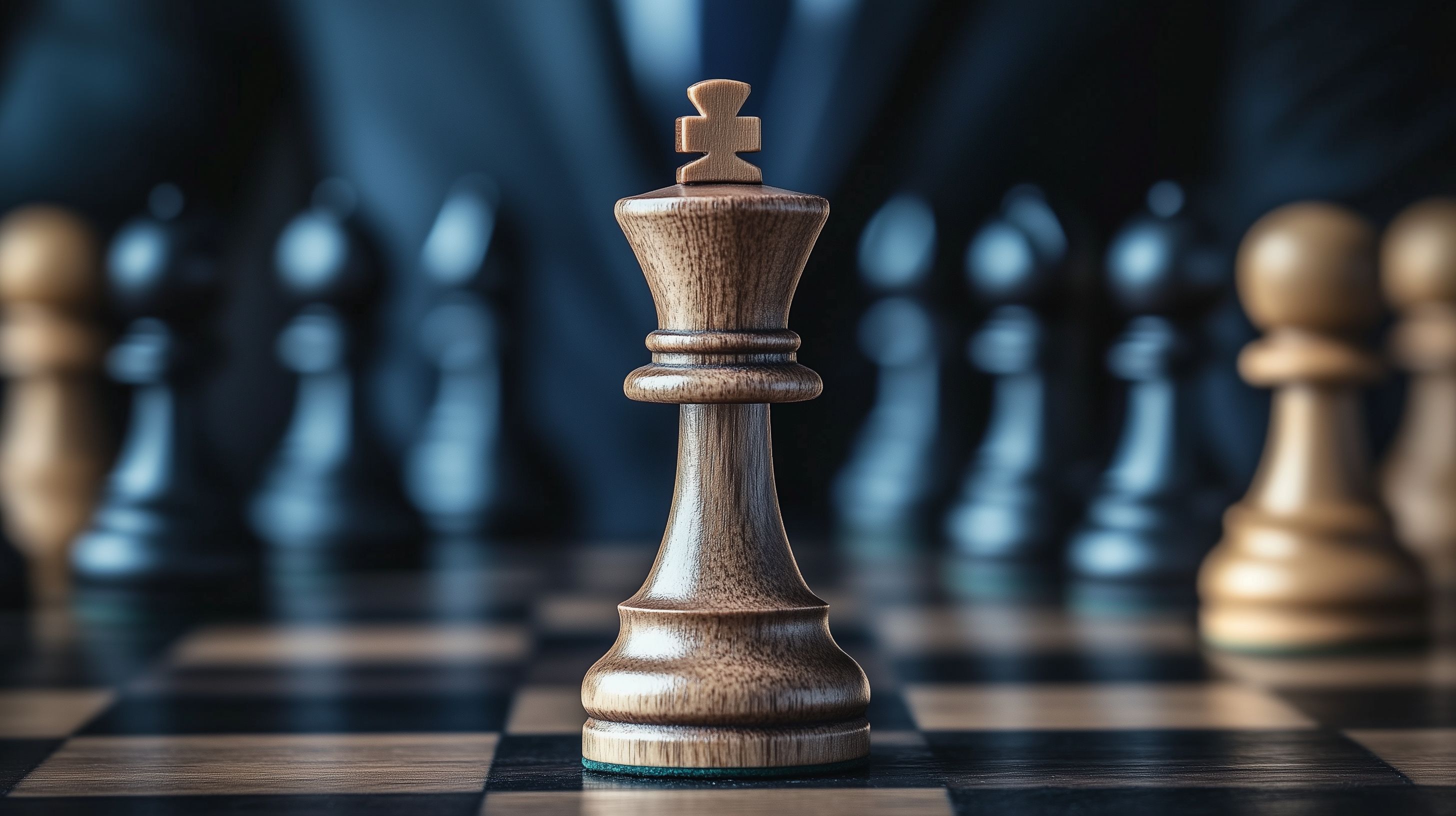 Das Bild zeigt eine Nahaufnahme einer Schachkönig-Figur aus Holz, die sich auf einem dunklen Schachbrett vor einem verschwommenen Hintergrund befindet. Die detailliert geschnitzte Figur ist in einem warmen Braunton gehalten und kontrastiert stark mit der düsteren, blauen Umgebung. Die Komposition lenkt den Fokus direkt auf den Schachkönig, was die Bedeutung und Stärke dieser zentralen Spielfigur unterstreicht. Dieses Stockfoto eignet sich hervorragend für Blogs, Newsletter oder Social-Media-Beiträge rund um Themen wie Strategie, Wettbewerb, Logik oder auch allgemein für visuelle Darstellungen von Konzentration und Herausforderung. Das hochauflösende Bild steht unter einer Creative-Commons-Lizenz zur Verfügung und kann kostenfrei für verschiedenste Projekte genutzt werden.