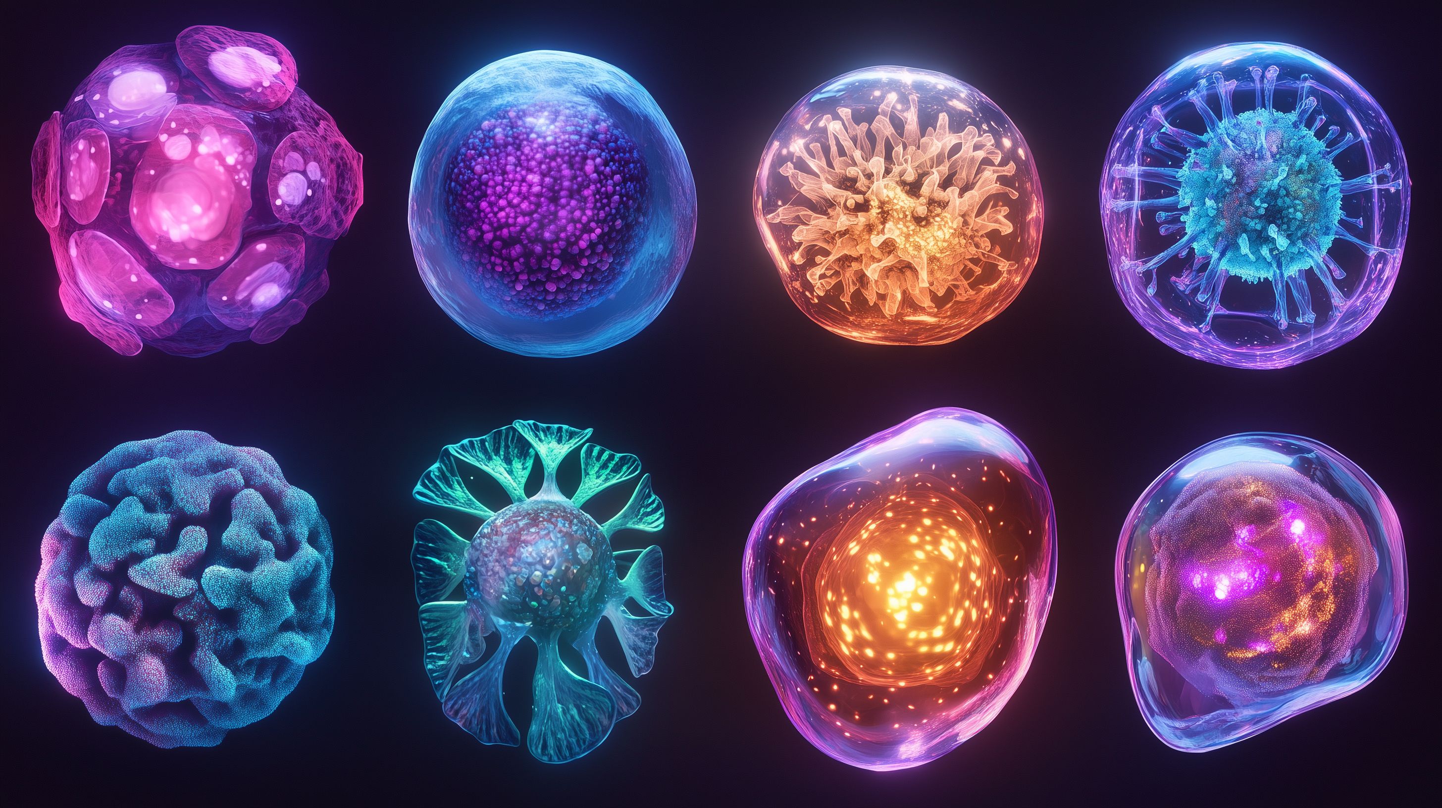 Dieses faszinierende Bild zeigt eine Reihe leuchtender, abstrakter Zellstrukturen in lebendigen Farben wie Lila, Blau, Orange und Türkis. Die Formen erinnern an Mikroorganismen, Zellkerne oder chemische Strukturen, sind aber künstlerisch verfremdet und in einem dunklen Hintergrund angeordnet. Die digitale Illustration hat eine hohe Auflösung und kann vielseitig als kostenloses Stockfoto für Blogs, Newsletter, Social-Media-Posts oder Werbematerial verwendet werden - unter Beachtung der Creative-Commons-Lizenz.