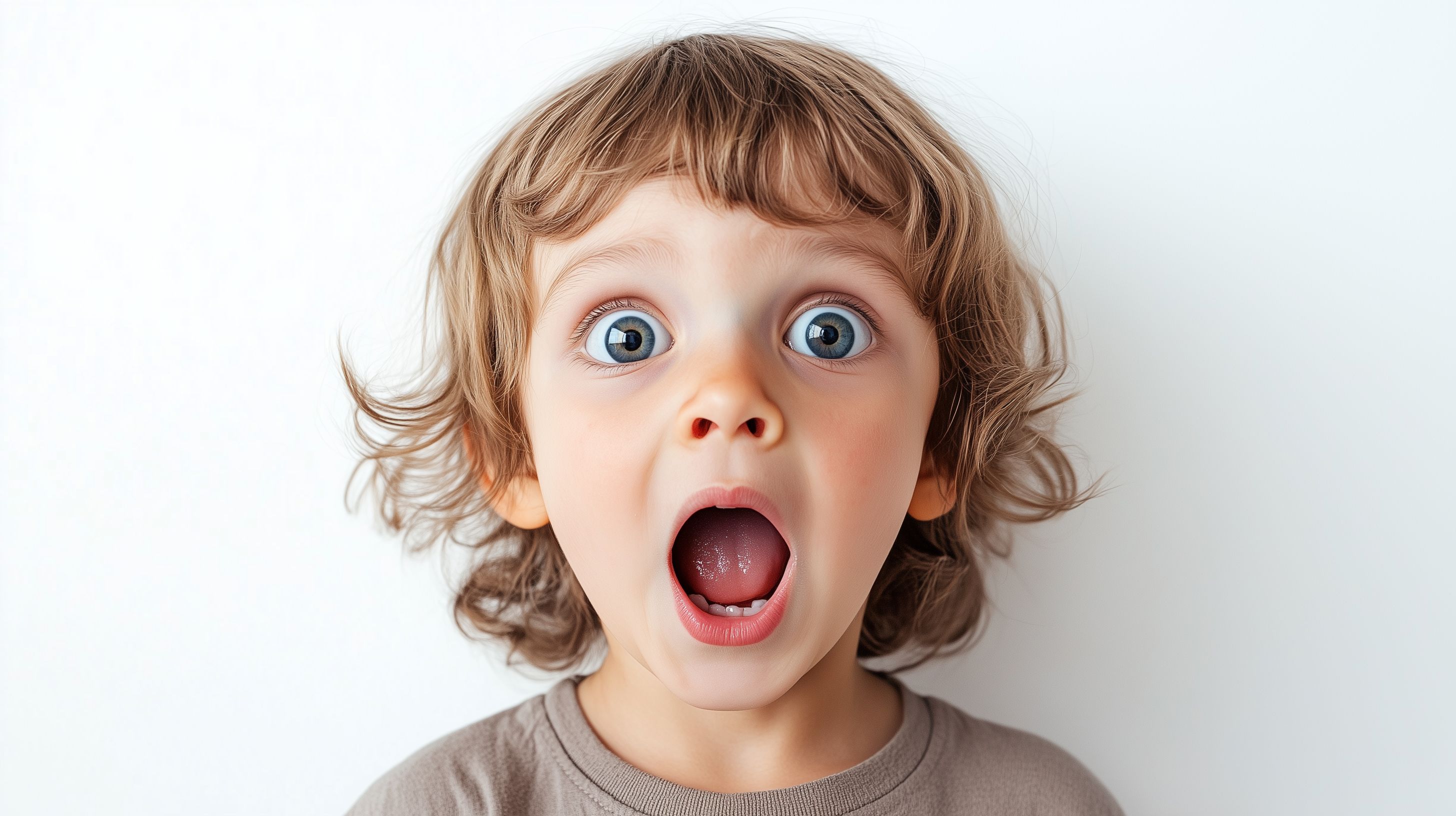 Dieses Foto zeigt ein erstauntes, kleines Kind mit großen, blauen Augen und offenem Mund. Der Hintergrund ist weiß, was den Fokus ganz auf den emotionalen Gesichtsausdruck des Kindes lenkt. Das Bild vermittelt eine Mischung aus Überraschung, Verwunderung und Faszination. Es eignet sich hervorragend als kostenfreies Stockfoto für Veröffentlichungen in Blogs, Newslettern, Werbematerialien und sozialen Medien. Die hochauflösende Qualität und Creative-Commons-Lizenz machen es zu einem flexibel einsetzbaren Foto für verschiedenste Zwecke.