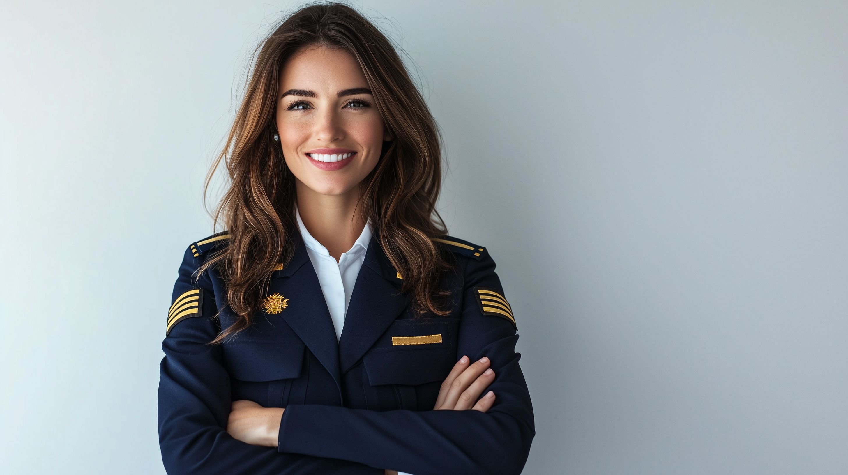 Das Bild zeigt eine lächelnde Frau in einer marineblau-goldenen Pilotenuniforma mit Abzeichen und Epauletten. Sie steht mit verschränkten Armen vor einem weißen Hintergrund, was ihre Selbstvertrauen und Professionalität betont. Das Hochformat-Foto eignet sich ideal für den Einsatz in Artikeln, Blogs oder Social-Media-Posts, die sich mit Karrieremöglichkeiten, Führungsqualitäten oder der Rolle von Frauen in der Luftfahrtbranche befassen. Dieses hochauflösende Stockfoto ist unter einer Creative-Commons-Lizenz frei nutzbar.