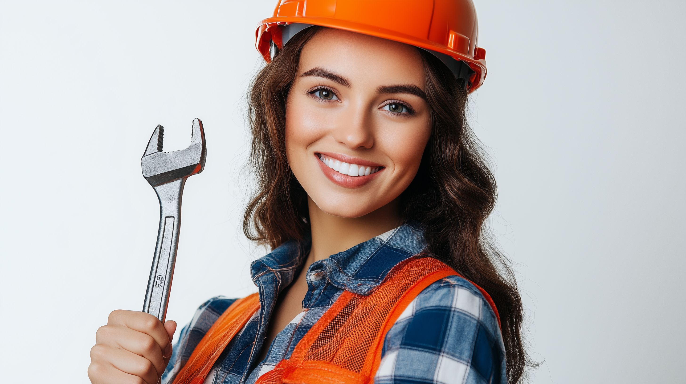 Das Bild zeigt eine lächelnde junge Frau in Arbeitskleidung und Sicherheitsausrüstung, die einen Schraubenschlüssel in der Hand hält. Sie trägt einen orangefarbenen Helm und eine karierte Jacke, die auf eine Tätigkeit im Baugewerbe hindeutet. Der Hintergrund ist einfarbig und konzentriert den Blick auf die Protagonistin. Das Foto strahlt Freundlichkeit, Kompetenz und Selbstvertrauen aus und eignet sich hervorragend für den Einsatz in Blogbeiträgen, Newslettern oder Werbematerialien rund um Themen wie Bauindustrie, Handwerk, Arbeitssicherheit oder Gleichberechtigung. Dieses hochauflösende, kostenlose Stockfoto steht unter einer Creative-Commons-Lizenz zur Verfügung.