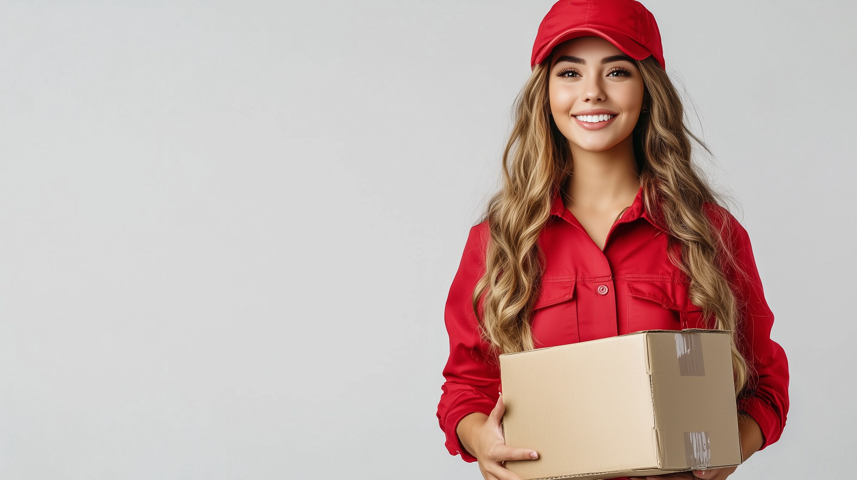Das Bild zeigt eine lächelnde Paketbotin in roter Uniform, die einen Pappkarton in den Händen hält. Sie steht vor einem hellen, neutralen Hintergrund und strahlt Freundlichkeit und Professionalität aus. Das Foto eignet sich hervorragend für den Einsatz in Online-Shops, Newslettern, Blogbeiträgen oder Social-Media-Kanälen, die mit dem Thema Paketversand, Logistik oder Liefer-Service in Verbindung stehen. Als kostenloses, hochauflösendes Stockfoto unter der Creative-Commons-Lizenz kann es frei und ohne Lizenzgebühren verwendet werden.