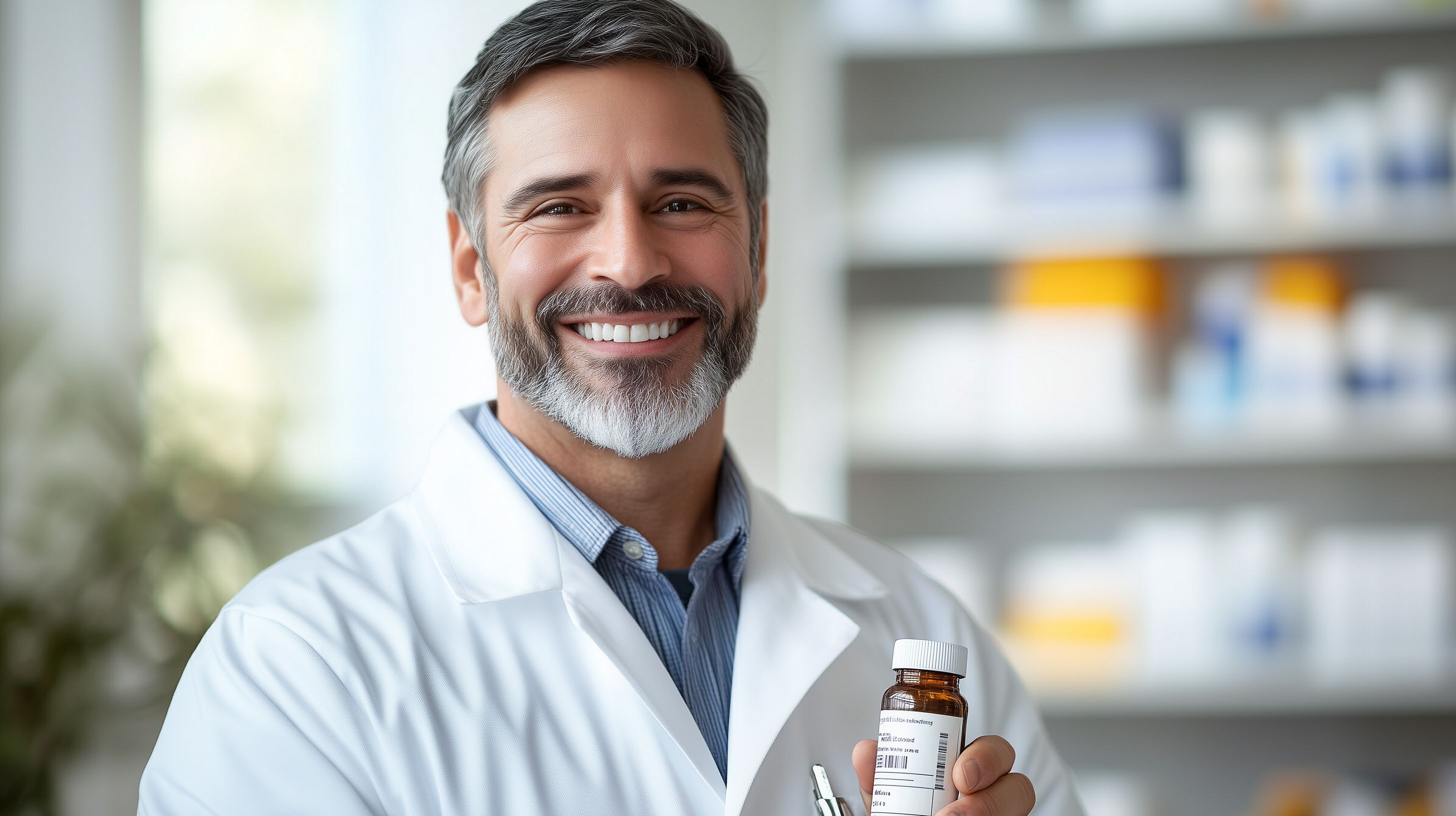 Das Foto zeigt einen freundlichen Apotheker, der in seinem Arbeitsumfeld, einer Krankenhausapotheke, aufgenommen wurde. Der Mann lächelt und hält eine Medikamentenflasche in seiner Hand, was seine Expertise und Professionalität in der Pharmazie unterstreicht. Der weiße Kittel, das Regal im Hintergrund und die saubere, geschäftige Umgebung vermitteln einen seriösen und vertrauenswürdigen Eindruck. Dieses Stockfoto eignet sich hervorragend für Verwendungen in Bereichen wie Gesundheit, Medizin, Pharmazie oder als Illustrationen für Artikel und Werbematerialien. Es ist in hoher Auflösung verfügbar und unter einer Creative-Commons-Lizenz frei nutzbar.