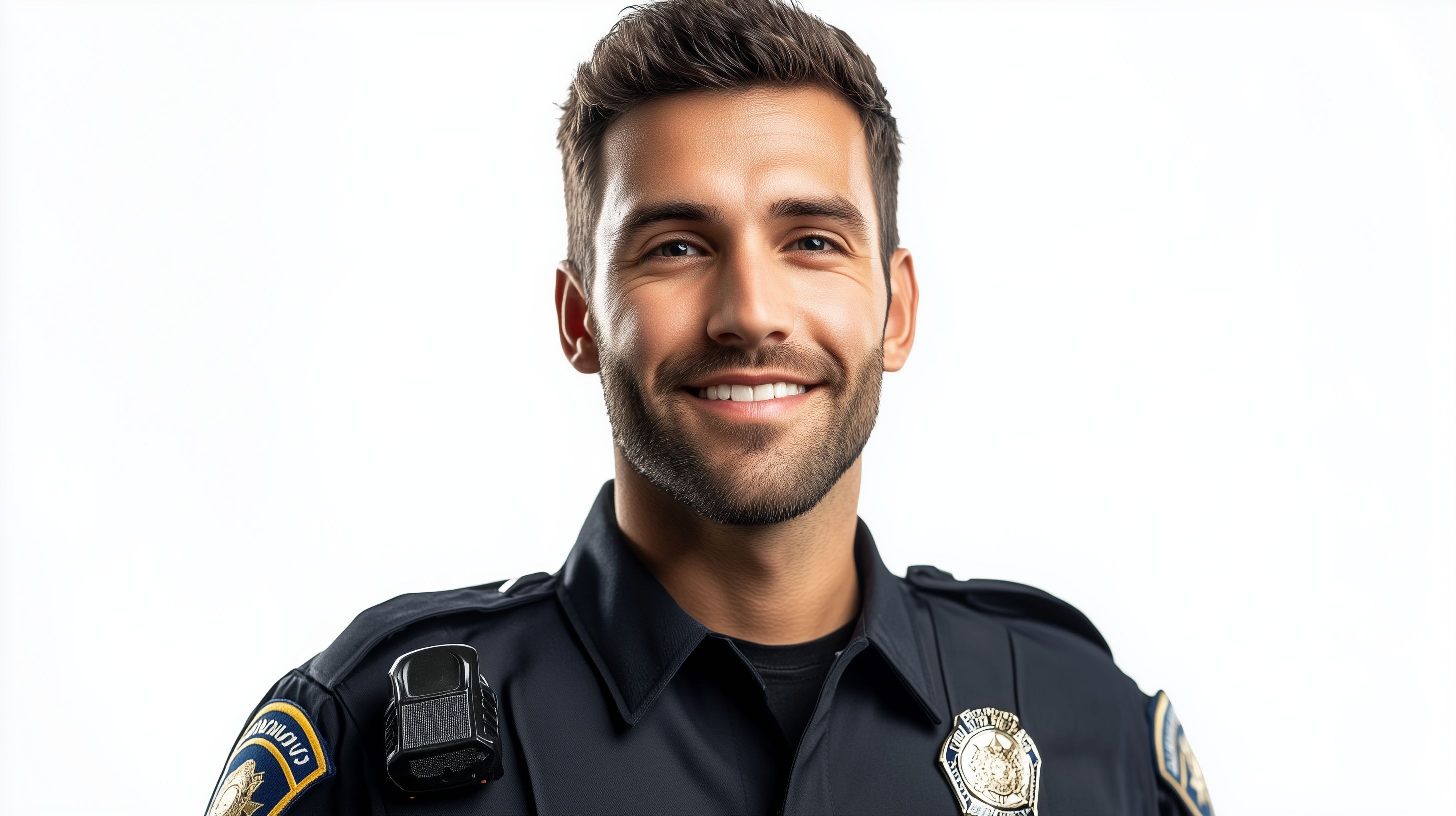 Das Foto zeigt einen lächelnden, freundlichen Polizeibeamten in voller Uniform vor einem weißen Hintergrund. Der Blick des Mannes strahlt Professionalität und Zuversicht aus, während sein Gesichtsausdruck eine positive, approachable Ausstrahlung vermittelt. Dieses hochauflösende Stockfoto eignet sich hervorragend für den Einsatz in Blogs, Newslettern, Werbematerialien und sozialen Medien, wo es einen Eindruck von Sicherheit, Schutz und Vertrauenswürdigkeit vermitteln kann. Das Foto ist unter einer Creative-Commons-Lizenz erhältlich und kann somit kostenlos für verschiedene Zwecke genutzt werden.