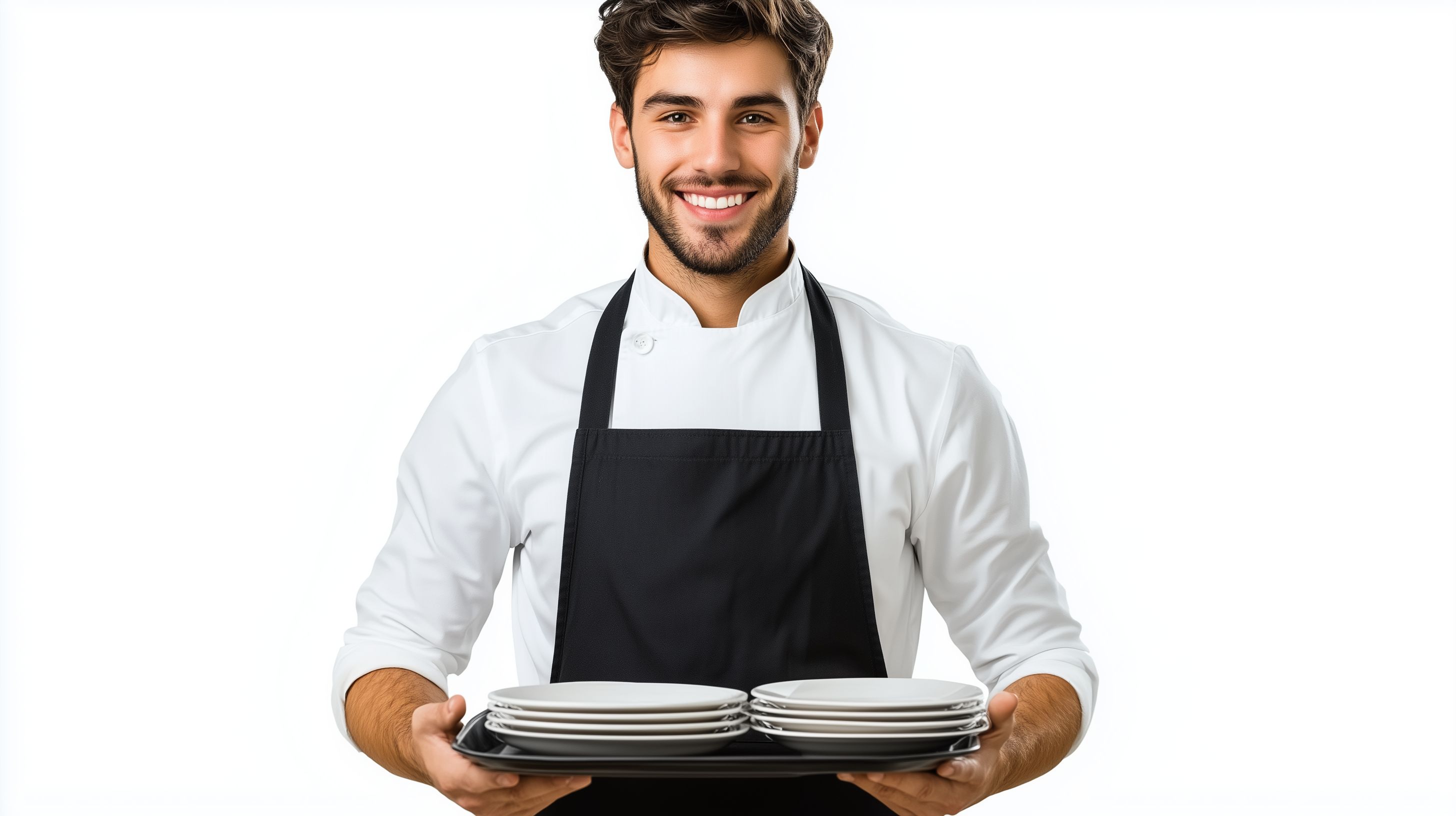 Das Bild zeigt einen freundlichen Kellner in weißer Uniform, der ein Tablett mit mehreren Tellern präsentiert. Der Mann lächelt und blickt direkt in die Kamera, was eine einladende und professionelle Ausstrahlung vermittelt. Die weiße Uniform hebt sich kontrastreich vom schwarzen Hintergrund ab und verleiht dem Bild eine klare, aufgeräumte Ästhetik.